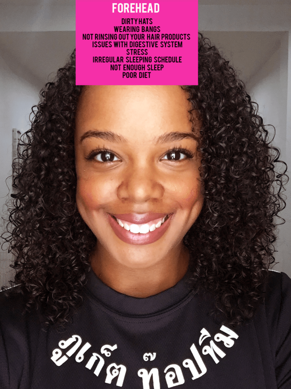 Breakouts on the forehead could be from wearing dirty hats, having bangs, or not properly rinsing out your hair products when you wash your hair. It could also indicate issues with your digestive system, stress, irregular sleeping schedule/not enough sleep, and a poor diet. If you find yourself with frequent forehead breakouts, try getting at least 7 to 8 hours of sleep a night, along with eating leafy greens and drinking more water.