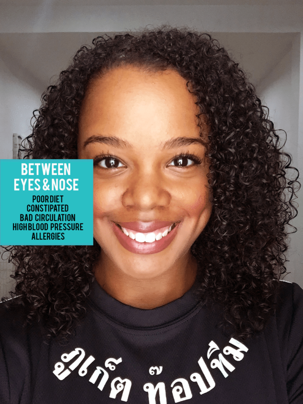 Acne in between your eyes and around your nose could mean that you have a poor diet, are constipated, bad circulation or high blood pressure. If you break out in between your eyebrows, that could be a sign that you have a food allergy. If you are lactose intolerant, you may also find that you have breakouts in between your brows. Again, it might be worth it to take a look at your diet and eliminate processed sugar, fast food, alcohol, and increase water intake.
