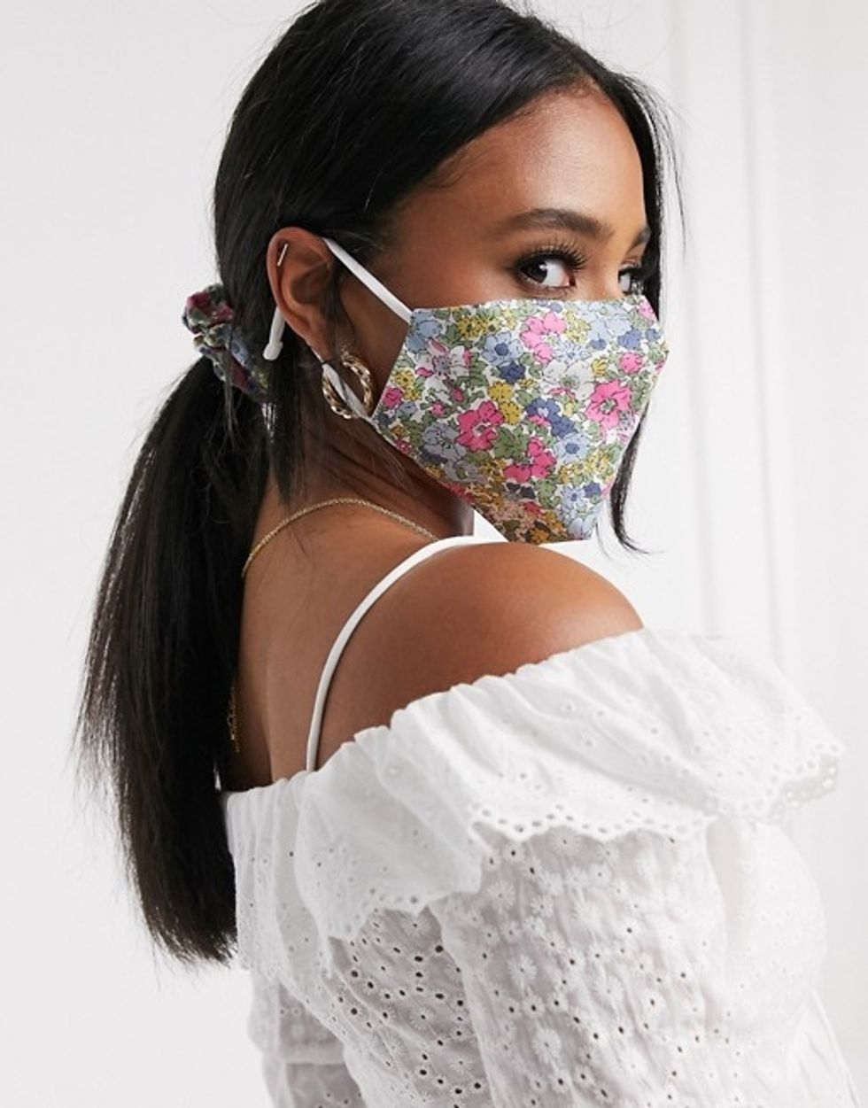 We love to see a matching set so we are obsessed with this floral face covering, pouch and scrunchie situation. The set is perfect for summer and presents a fun and flirty vibe.