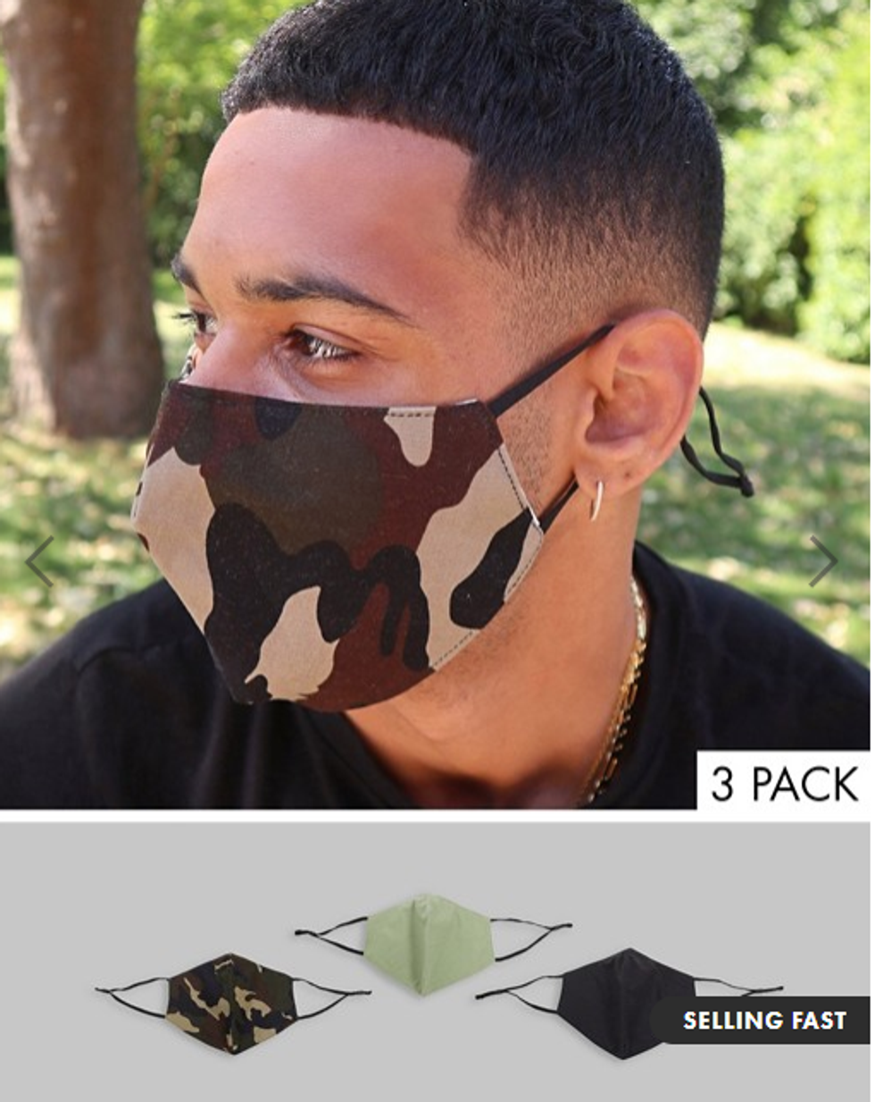 This pack of three comes with an assortment of prints and solid colors. They are uniquely designed with double-layer construction and elasticated straps with adjustable toggles. We really love the camo printed mask because you could style it up or down flawlessly.