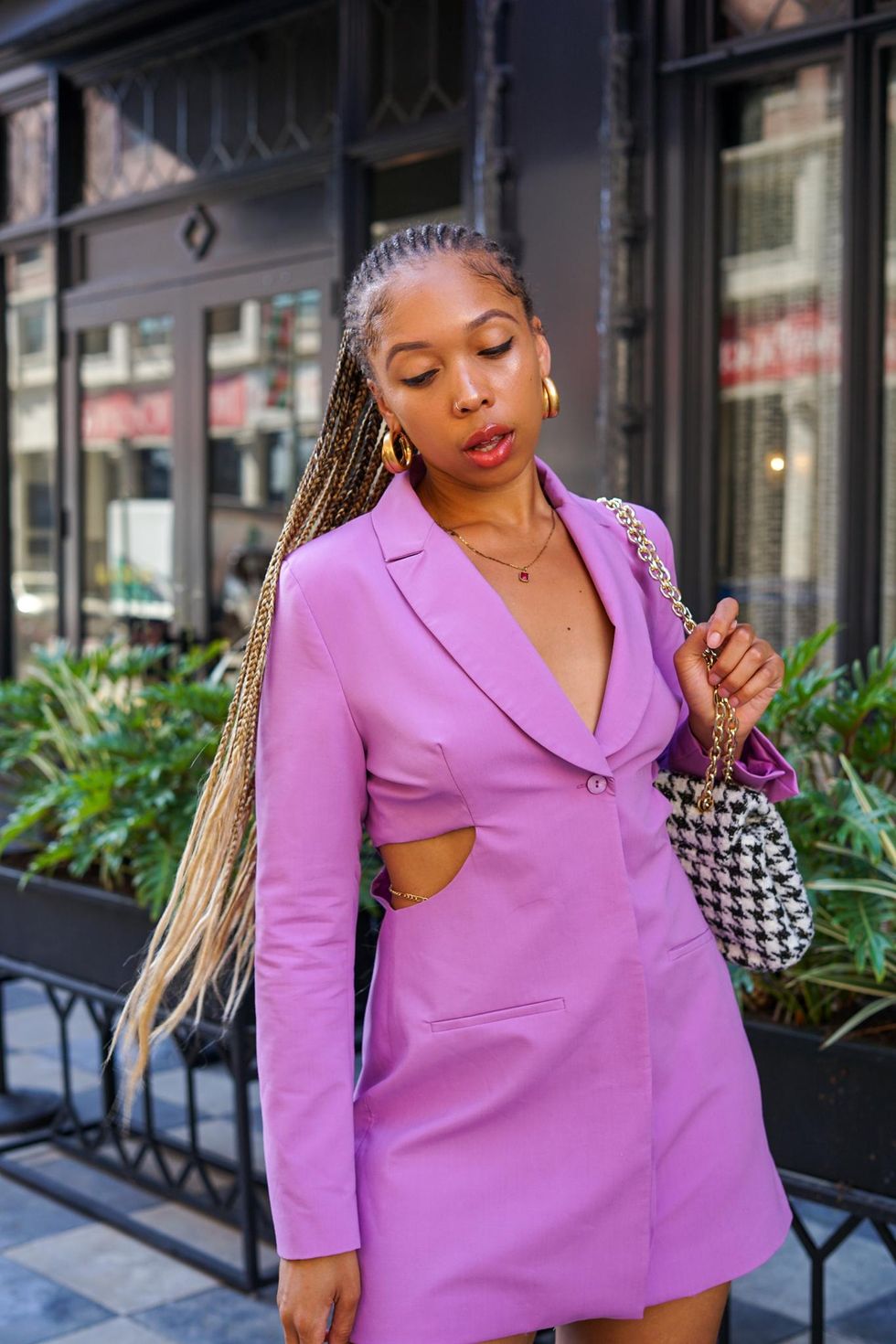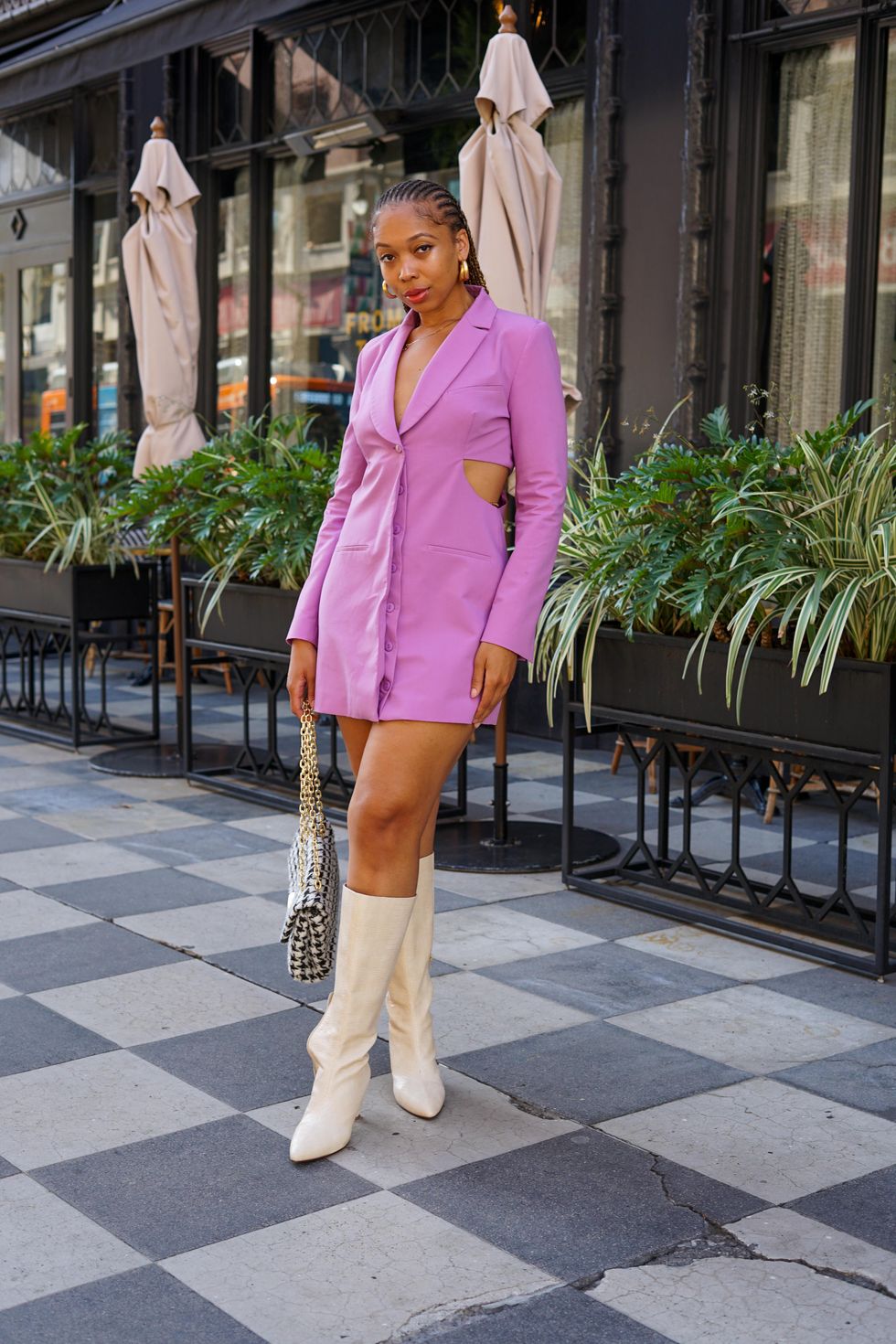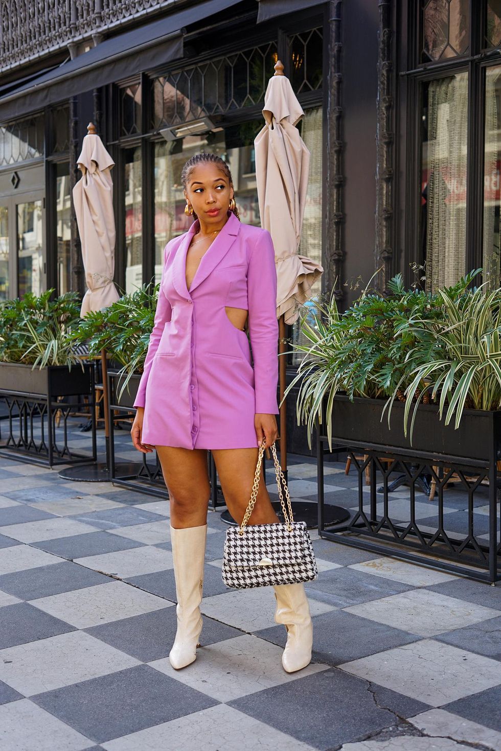 One thing about people in LA, we take brunch very seriously. Opting for a purple cut-out blazer dress, I decided to go for my favorite white boots from the brand Smash Shoes. Wearing a size 12 in shoes, it's always difficult to find boots in my size. When shopping with this brand, in particular, I'm always confident in a hassle-free experience to find a proper fit and stylish options. Adding texture to this bright weekend look, I paired a printed chain-strapped bag to complete a fun fashion moment.
