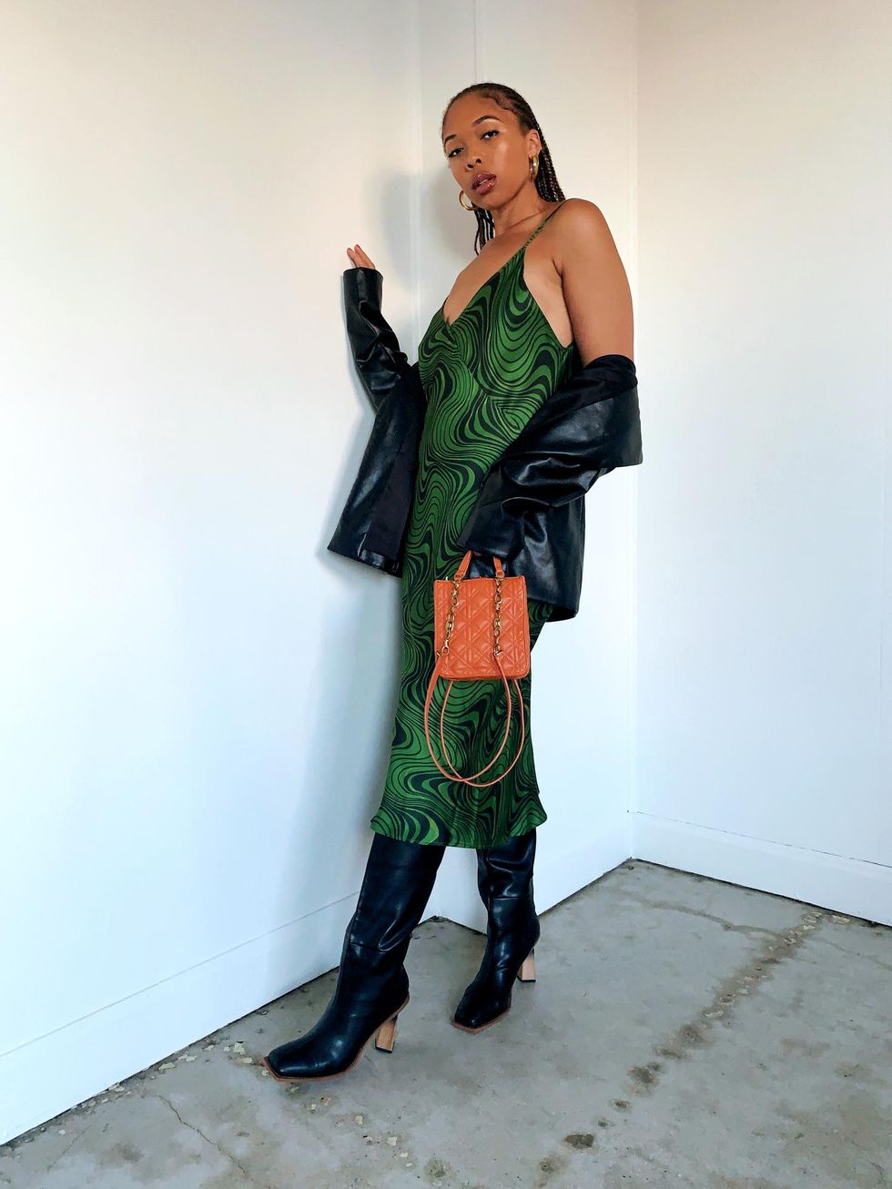 Loving the latest release from N.Y.A.S, I couldn't wait to wear my new black faux leather boots with this abstract print satin maxi for a fun color combination complete with a pop of an orange mini bag. Obsessed with dresses as of late, I wanted to pair this look with my square-toe boots for a chic, modern, yet western vibe. Day or night, this is the fall look I've been waiting for.