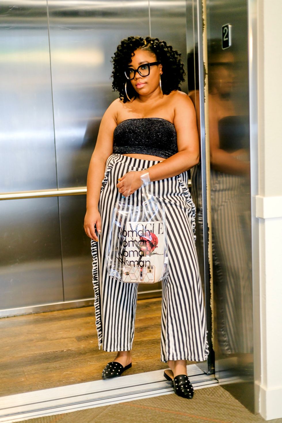PVC bags are all the rage these days. They are nostalgic and transparent, kinda like the 90's. I decided to wear this 'fit to the grocery store since this bag resembled a high-fashion grocery bag and I love to serve up a look to the clerks at my local market. I paired the Forever 21 PVC bag with a black bandeau top and high-waist flared pants because...comfort.