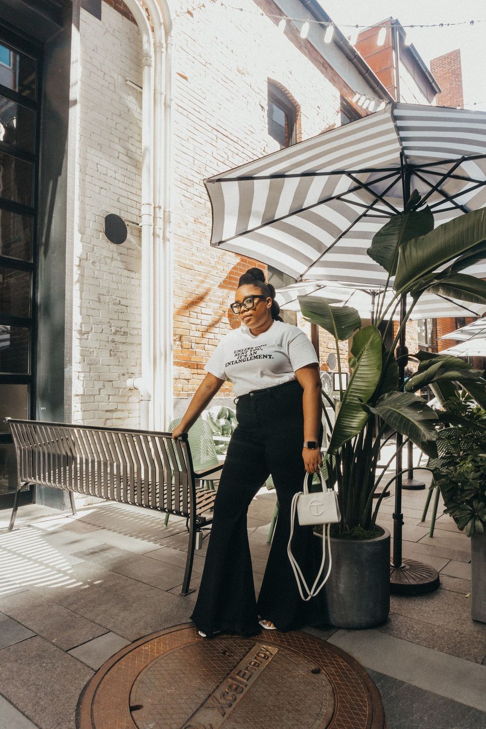 On my Janelle Monae tip, I paired my flares with a classic slogan white tee and white accessories because what's more timeless than black and white. When in doubt, pair one of your treasured tees with these bottoms to keep it cute and cool.