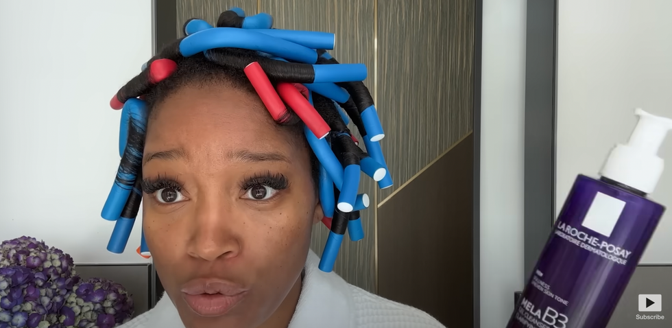 - Style: Sets her natural hair with flexi rods for defined, voluminous curls.