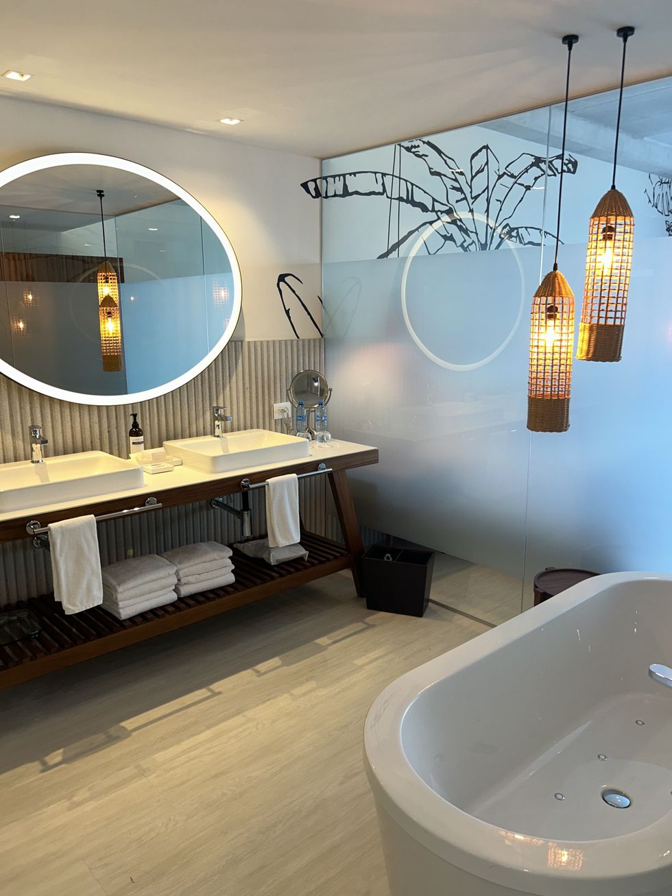 I was even more excited about the view from my room. My room overlooked Nichupté Lagoon, and throughout my stay, I would find myself being pulled to take in the view from my balcony or just sit and relax with a good book. The room itself was modern and spacious. The bathroom was a standout, thanks to the grand mirror that hits you when you first walk in and the roomy shower with two waterfall shower heads.
