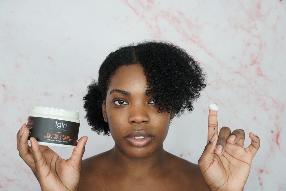 Apply the Butter Cream Daily Moisturizer by tgin, a Black-owned brand that promises to add additional moisture, shine, and seal moisture.