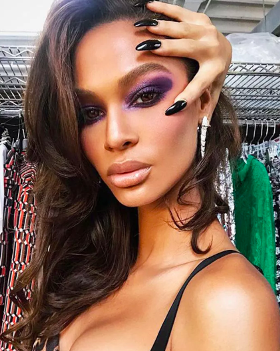 Joan Smalls gave us the perfect holiday party inspiration with this dramatic purple eye created with the Marc Jacobs Beauty Eye-Conic Multi-Finish Eyeshadow Palette in Frivoluxe complemented by a simple, nude lip.