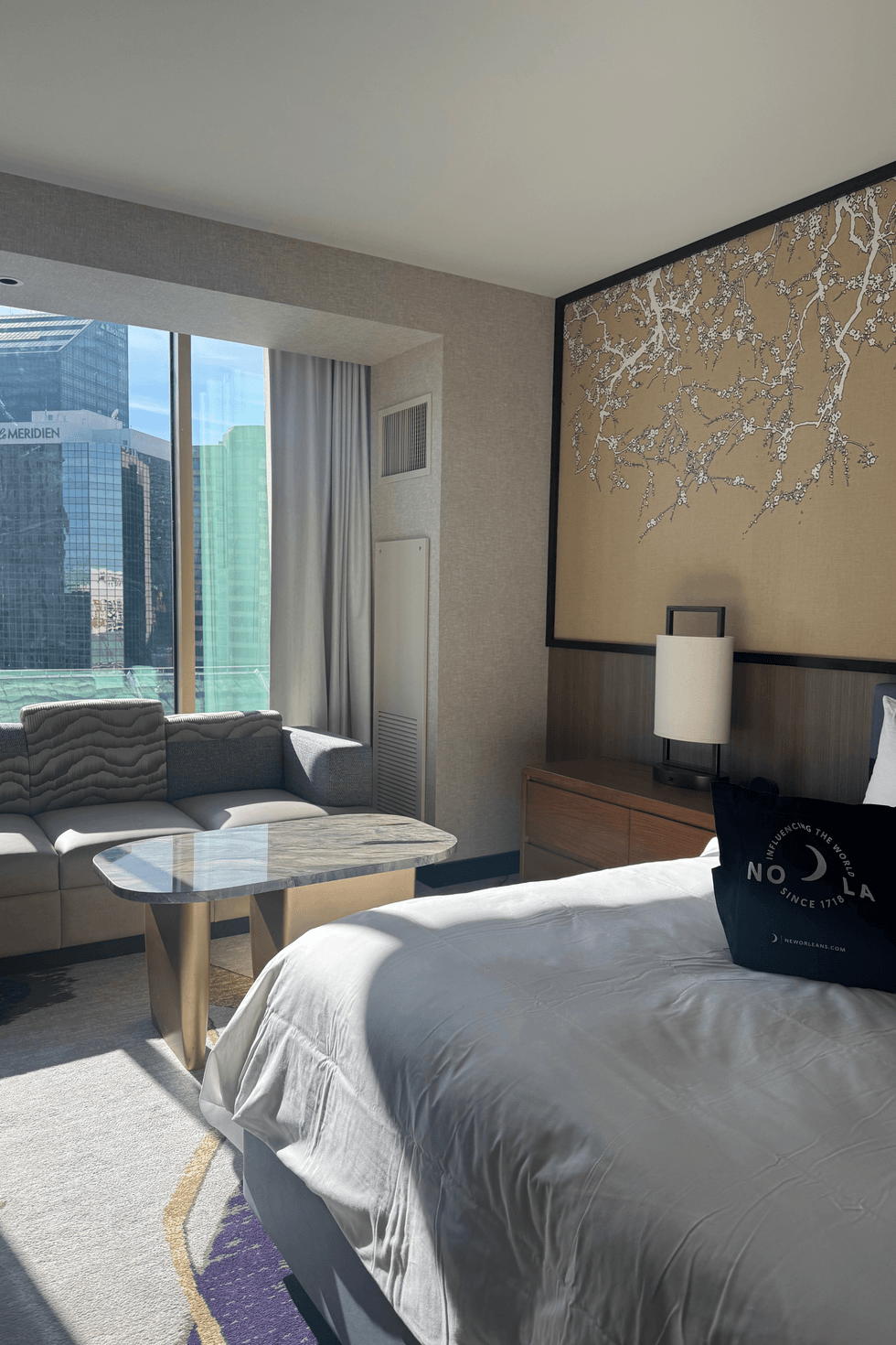 There is a private entrance that feels calmer by design. After check-in, I was handed a chilled matcha lemonade I am still trying to recreate. The rooms lean darker by design in comparison to Caesars' signature rooms with deep neutral tones, soft lighting, and subtle Japanese nuances that create a sense of quiet the moment you step off the elevator. That balance, modern design paired with southern hospitality, showed up everywhere.