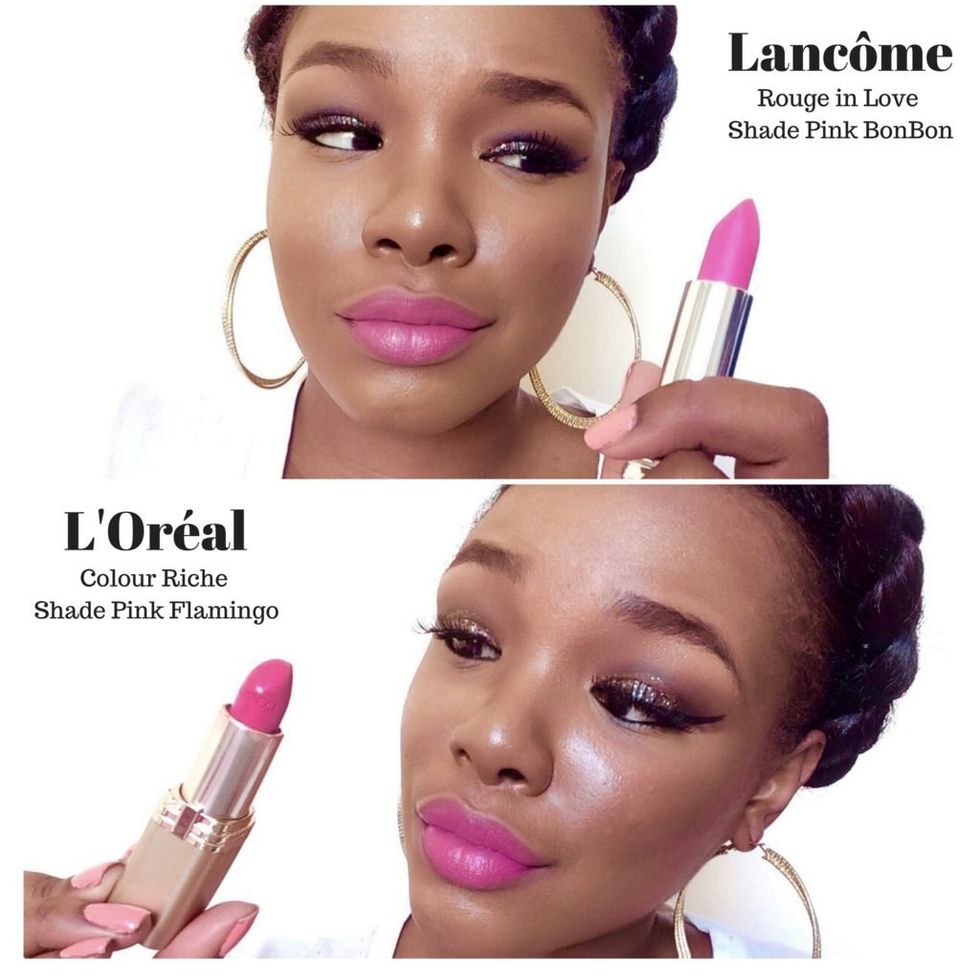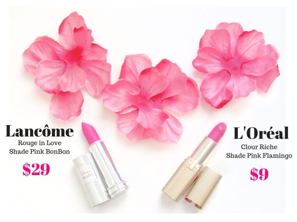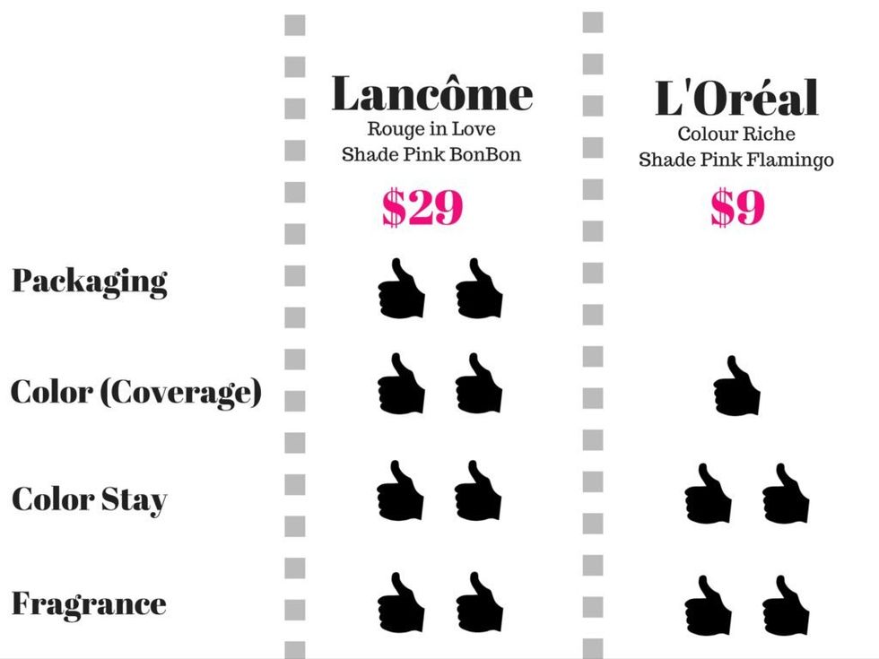 Say for instance the luxury brand Lancome, which is owned by L'Oreal. Lancome's Rouge in Love Shade Pink Bon Bon lip color, is equivalent to L'Oreal's Colour Rich Shade Pink Flamingo, however, you will pay three times as much for Lancome than L'Oreal.