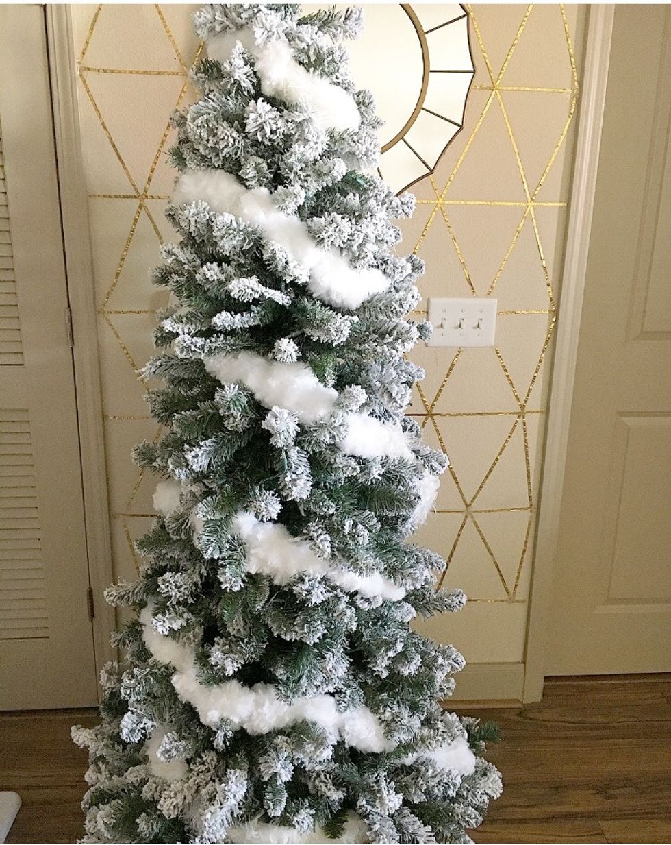 This can be done with faux fur garland, a faux fur rug (you can always cut it into rectangles), or if you want to save a few coins, you can use white dusters! Yes, you read it correctly, DUSTERS! Starting at the top, I placed the fur between the branches and went all the way around the tree. Therefore when I finished, it created a "spiral" look around the tree.