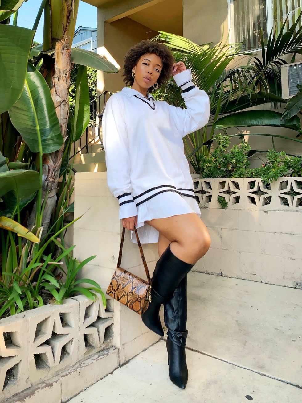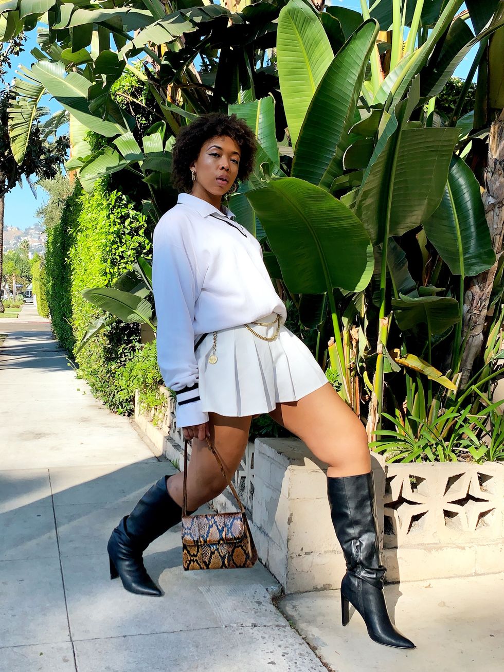 Peeking outside of my bedroom window, I am pleasantly surprised by the thick early-morning fog that crept into our neighborhood seemingly out of nowhere. As excited as I am to finally layer up on a few of my favorite fall items, I know there is a strong likelihood of temperatures rising throughout the day, so I'll need to be smart about my outfit selection. While hoping to avoid overheating by lunch, I start out with a white tennis skirt and calf boots paired with a white button-up underneath a pull-over sweater. I top with an oversized leather jacket for the win. Taking full advantage of the cool temperatures, even if only for a few hours, I'm ready to step out in my fall-ready outfit.