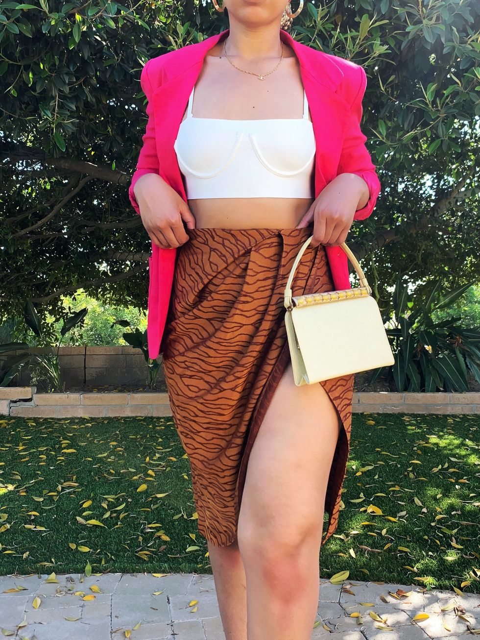 The wrap skirt is one of my favorite styles. It is casual comfort meets effortless elegance. The combination of colors within this particular wrap skirt's pattern coordinates perfectly with the vibrant hot pink blazer. This outfit is a great idea for upcoming spring/summer evening occasions.