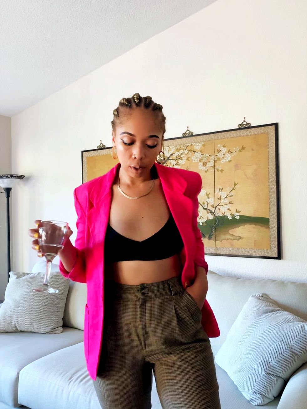 For a more tailored look, pairing plaid trousers with this hot pink blazer is a fun play on a classic print and vibrant color. Talk about "Savage". This outfit is the perfect balance of polished with a dash of spice, thanks to the strategically placed glimpses of skin worked into the ensemble.