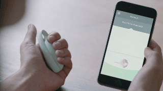 As you squeeze the pod, a gem appears again on your smartphone screen, which is reflective of how hard you are squeezing in real time. The object is to keep the gem above the line, and as you can see, my muscles are pretty weak in that region.