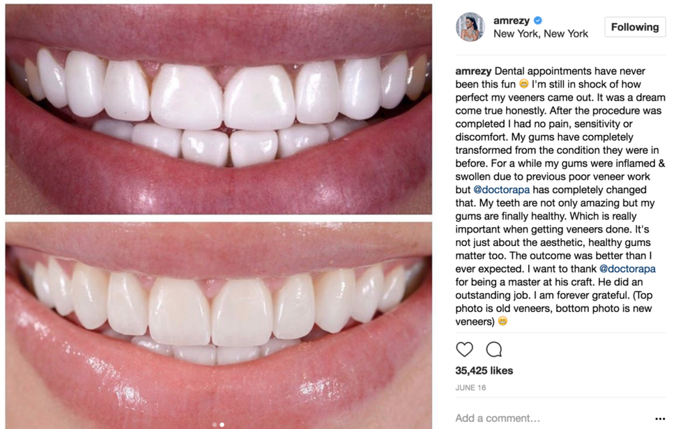 “My old teeth were obviously horrendous. I remember when I first got them done, how many people I blocked because when I first posted the photo they were like 'omg you look like a horse.' Lowkey, I knew I looked like a horse, but I didn't want to admit it because obviously, I had just spent so much money on getting them done. The last thing I wanted to hear was an insult. Even though they were right, that was the last thing I wanted to hear. My new teeth aren't as white as the previous ones. My old veneers were a part of the bleach shades, so I picked the lightest shade in the history of mankind."I don't know why and like I said before I didn't do my proper research the first time around and I made every kind of mistake I could have made. I picked the wrong dentist and I picked the wrong shade. The reason why these now look natural was the shape, my gums look natural, and the shade is part of the human shades and not the bleached shades. I'm actually happy that they aren't as white as before because the first thing you would notice when I opened my mouth were my teeth. They were glowing and not in a good way. So I definitely made every smart decision this time and my dentist was absolutely amazing." – Amrezy via Snapchat