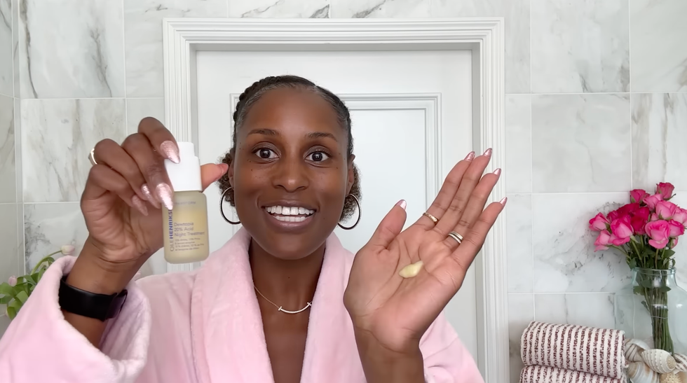At the top of the video, the 38-year-old revealed that she hasn't had any breakouts in over a year thanks to the Olehenriksen Dewtopia 20% Acid Night Treatment. Rae shares that she usually applies the serum at night before bed and rinses it off the following morning.
