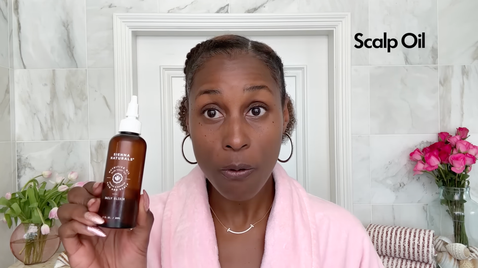 Further into the video, Rae stressed the importance of scalp care being considered a part of a skincare routine, especially within the Black community, as she applied Sienna Naturals Daily Elixir Hair & Scalp Oil throughout her scalp.