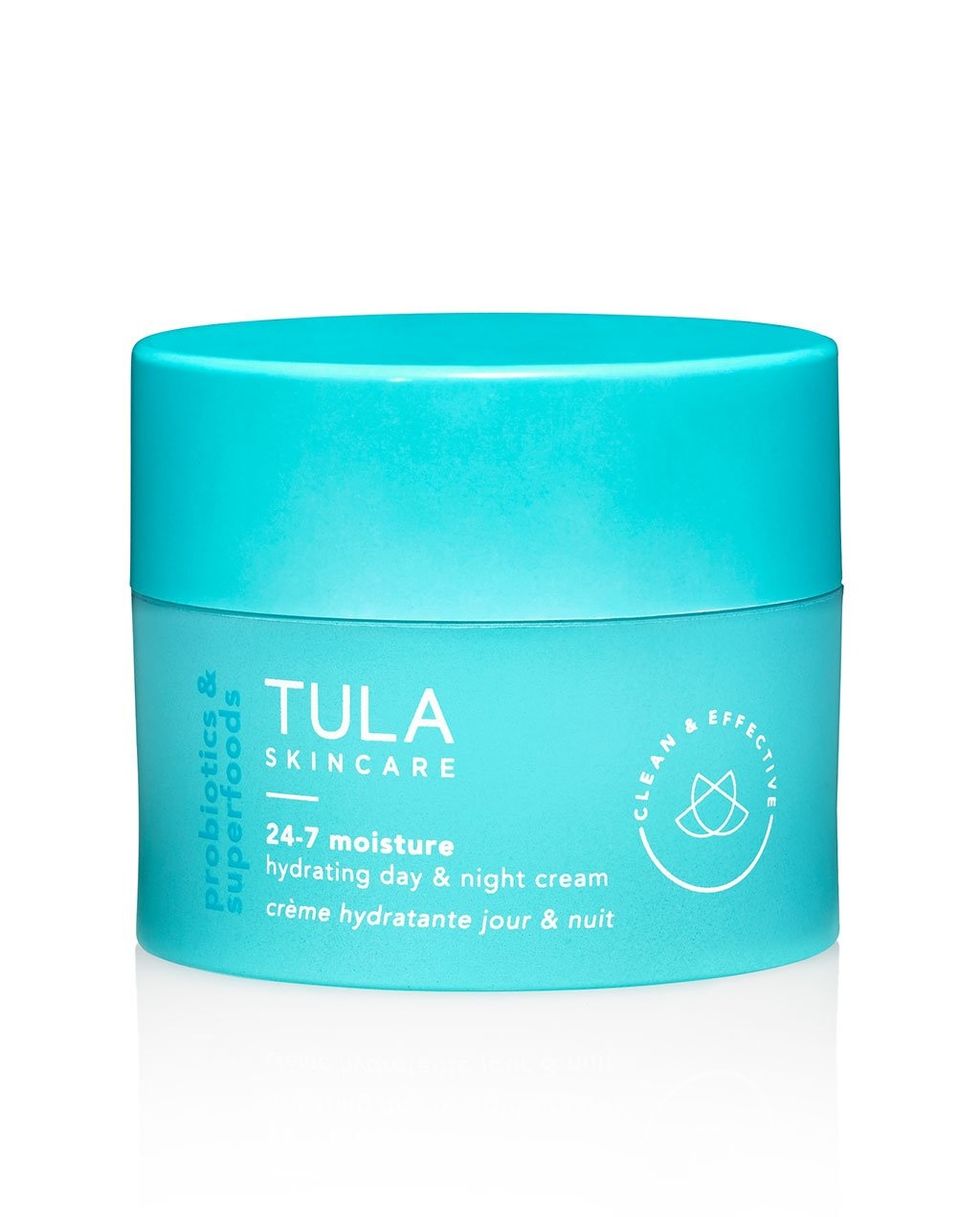 "I wash with black soap, then I follow up with Tula 24-7 Hydrating Day & Night Cream. My more complex routine is at night so the morning is fairly simple."