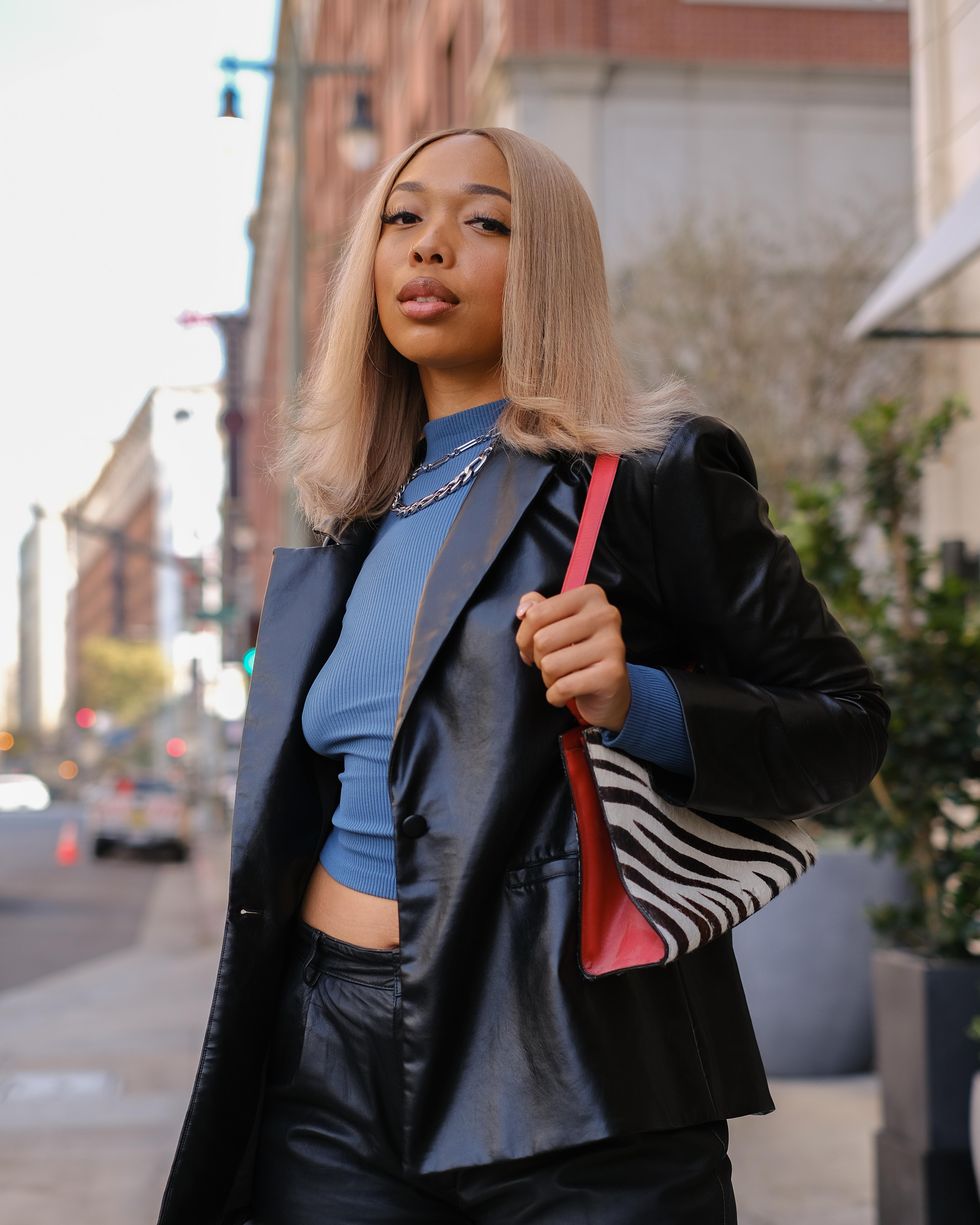 While outdoor events are limited this year, when we do step out, we deserve to go out in style. Shorts are another option for winter leather ideas. I love a knit vest as they are one of my favorite trends of 2020. I decided to layer this look with a long-sleeve button-up along with slouchy leather boots and my mini Telfar Bag for a stop and stare color combo. If needed, add a long winter coat for more warmth while bracing outside temperatures.