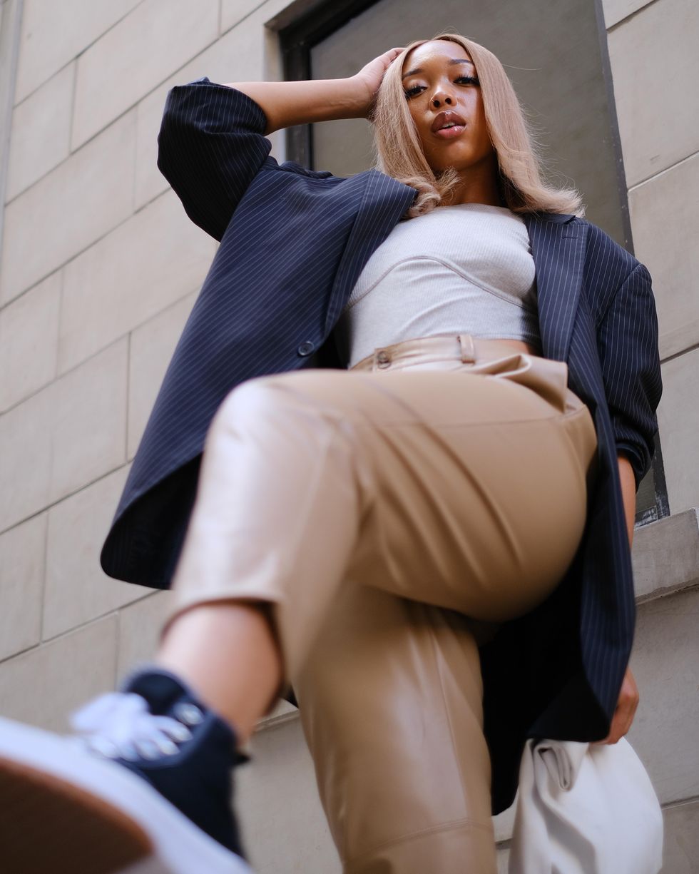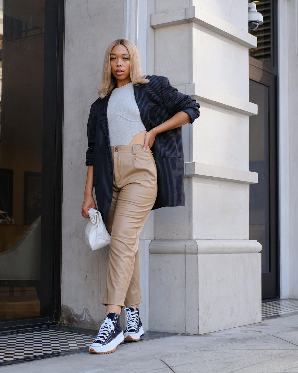 Since many of us are working from home, we can create our own dress code. For those living in warmer climates, a long-sleeve paired with a blazer is all we need to stay warm this fall. Switch up your leather by wearing a taupe-colored straight leg pant for more variety while adding a classic high top Converse sneaker for an effortless chic look.