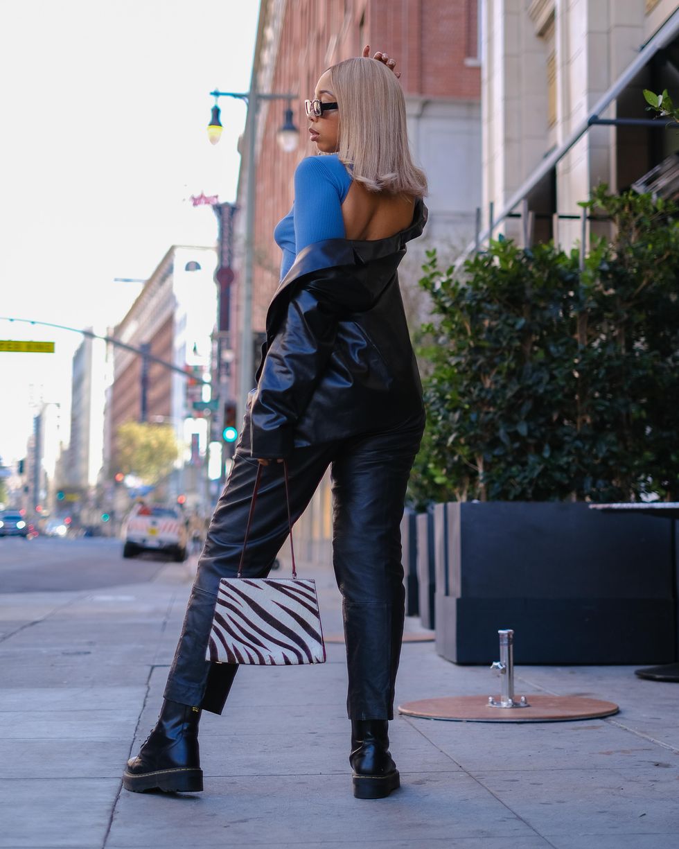 While outdoor events are limited this year, when we do step out, we deserve to go out in style. Shorts are another option for winter leather ideas. I love a knit vest as they are one of my favorite trends of 2020. I decided to layer this look with a long-sleeve button-up along with slouchy leather boots and my mini Telfar Bag for a stop and stare color combo. If needed, add a long winter coat for more warmth while bracing outside temperatures.