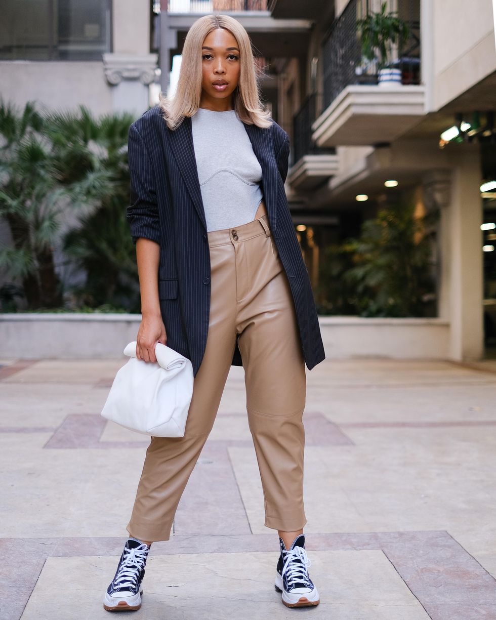 Since many of us are working from home, we can create our own dress code. For those living in warmer climates, a long-sleeve paired with a blazer is all we need to stay warm this fall. Switch up your leather by wearing a taupe-colored straight leg pant for more variety while adding a classic high top Converse sneaker for an effortless chic look.
