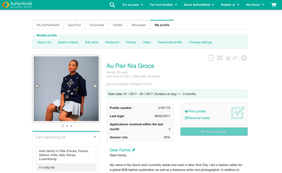 I used an independent website, aupairworld.com, in which both families and Au Pairs register for free. After registration, I simply made a profile featuring general information about myself, why I want to Au Pair, my experience with kids, and a few pictures. Families that register will also complete similar sections on their page. From there, the site's "easy find" feature is available to search for matching families. And, like in my situation, families will send applications directly to Au Pairs.