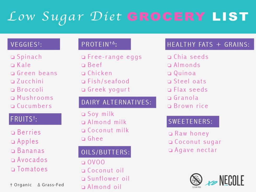 Here is an example of the low to no sugar grocery list I try to abide by when stocking up every couple of weeks: