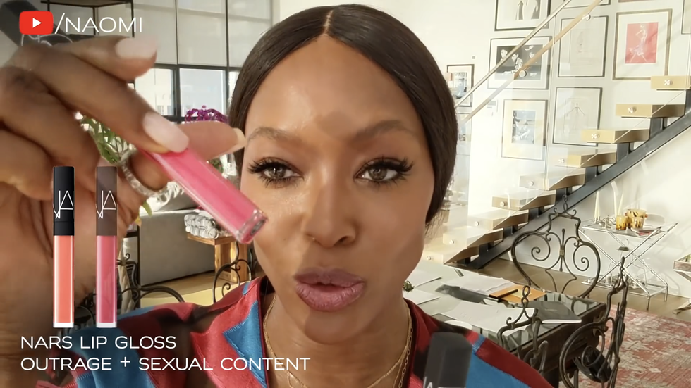 After retaching for her coveted contour palette to finish shading her nose and neck, Naomi uses a large spooley to groom her brows and gets her lip gloss poppin'. It pretty much seems like Naomi created pink lip color with this vibrant mix of Outrage and Sexual Content.