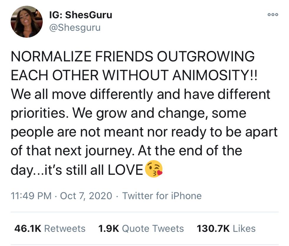 Sheriden: It's normal to outgrow people. It can be difficult if you don't have tools to communicate it. We have the conversation around relationships, and not necessarily friendships. Currently dealing with this issue.