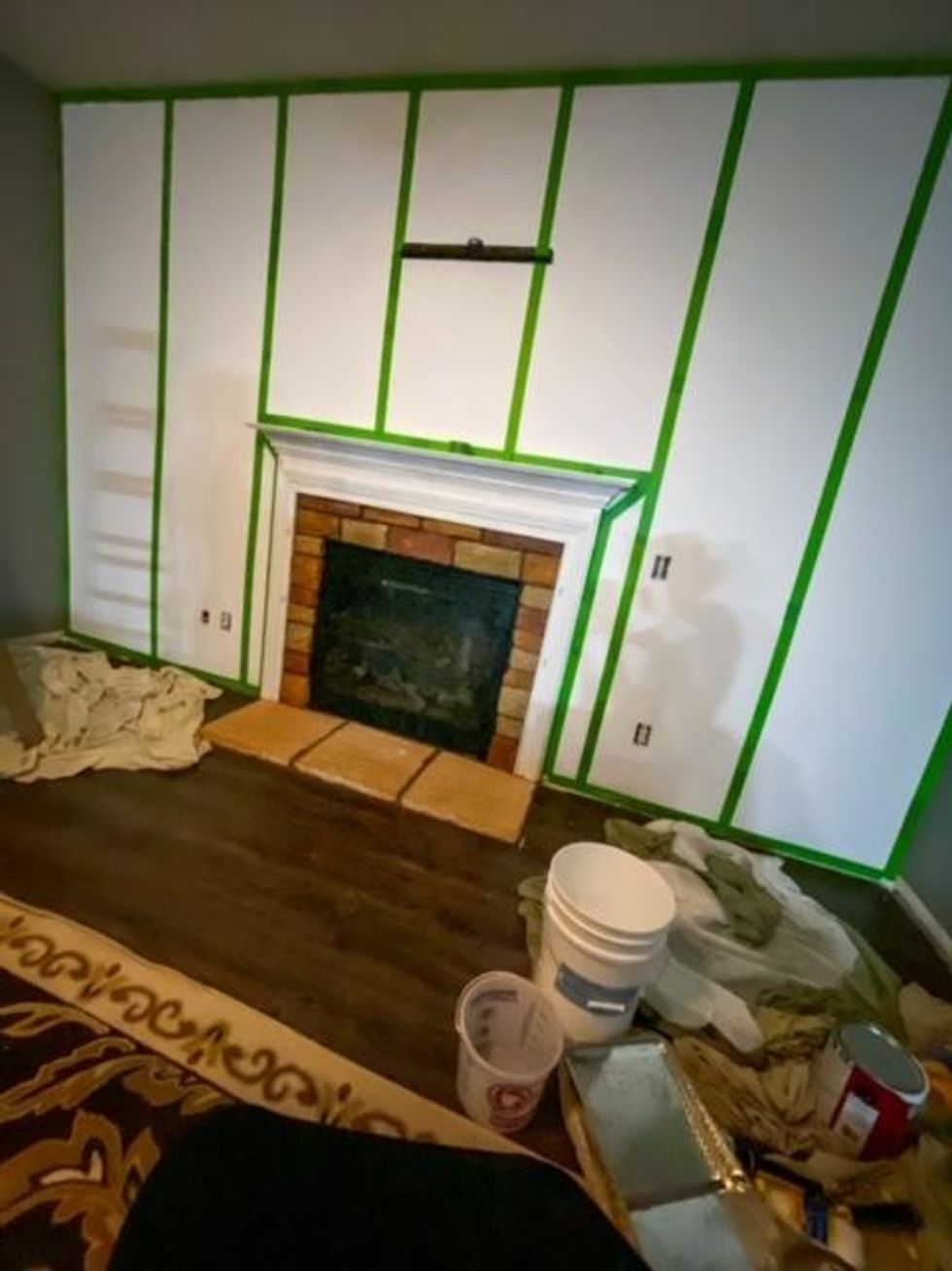 We first had to paint the wall white. Thank God for my husband because I was going to do it all backwards. I was going to tape it then paint it white, my husband informed me that if we did it that way, we would be painting for days and then it wouldn't have looked right.