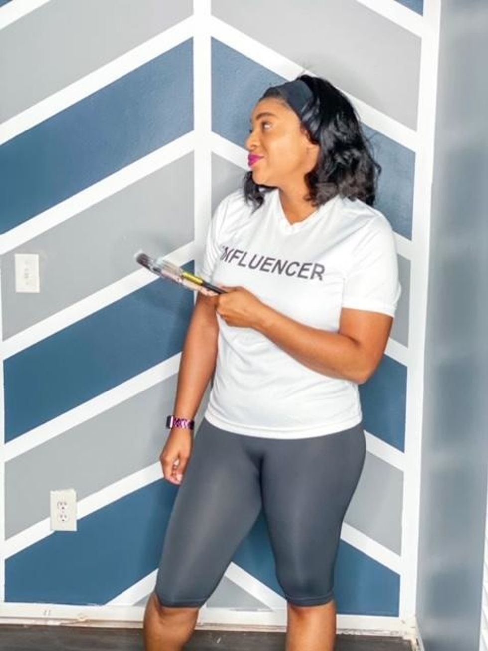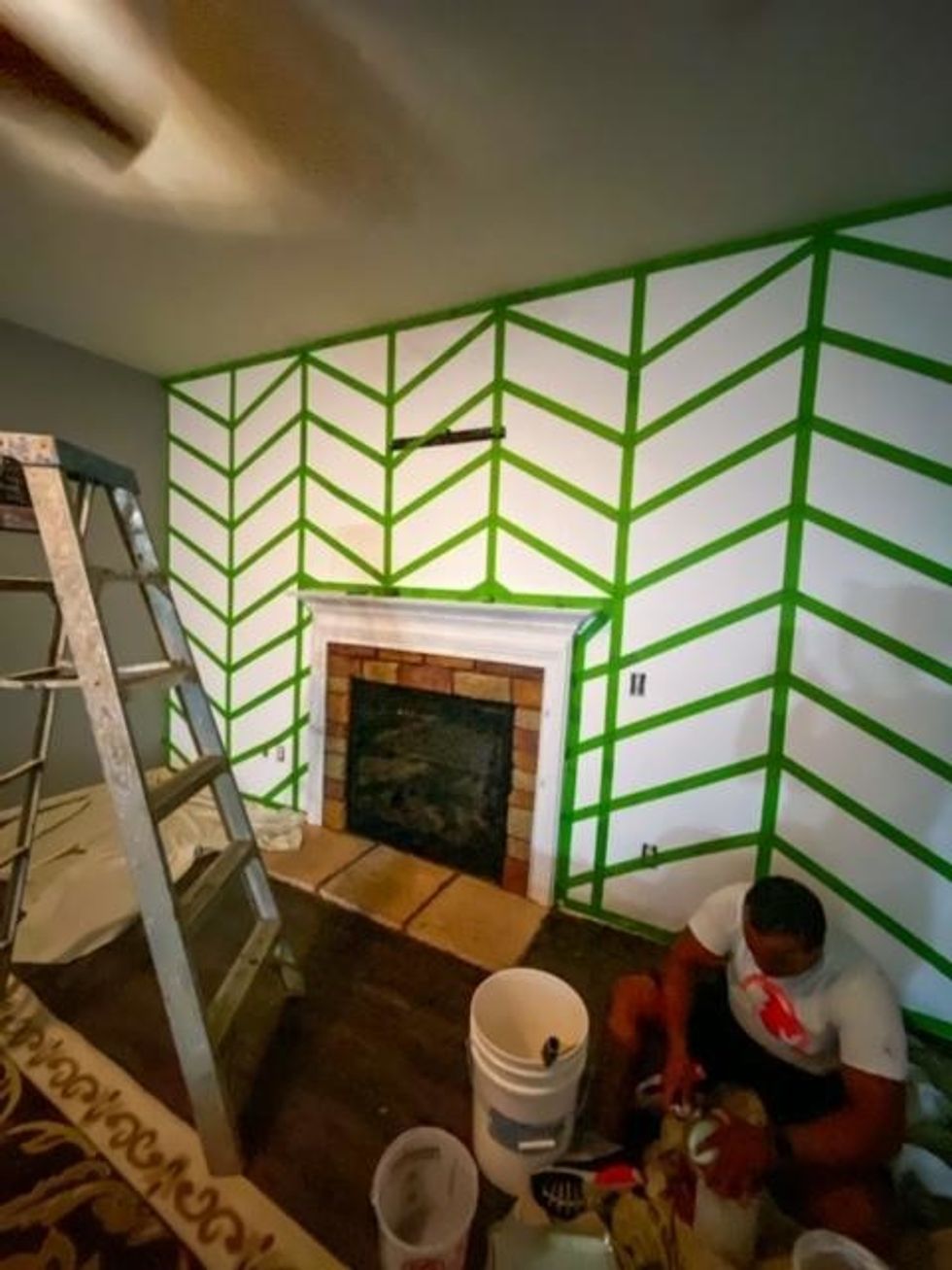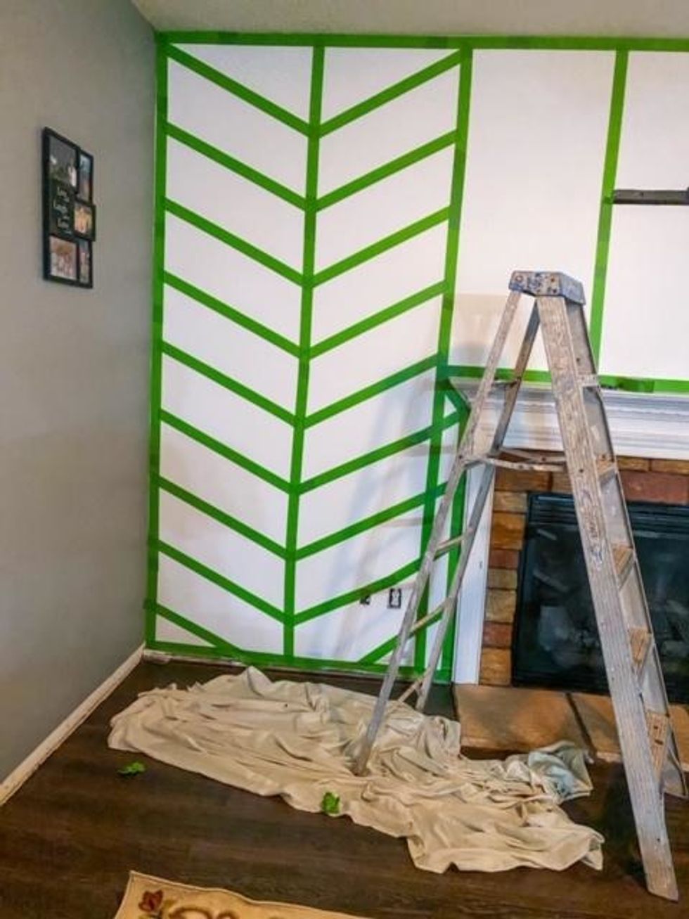 I took to Pinterest and saw a chevron print and fell in love. Y'all, I looked high and low for a chevron print stencil and I've seen others do their walls with a stencil, but I couldn't find one large enough. The small ones would have taken days maybe even weeks to finish. My husband is an Architect Designer, so I asked him if he thought he would be able to do it with tape and he was like, "Oh yeah, I can do that!"