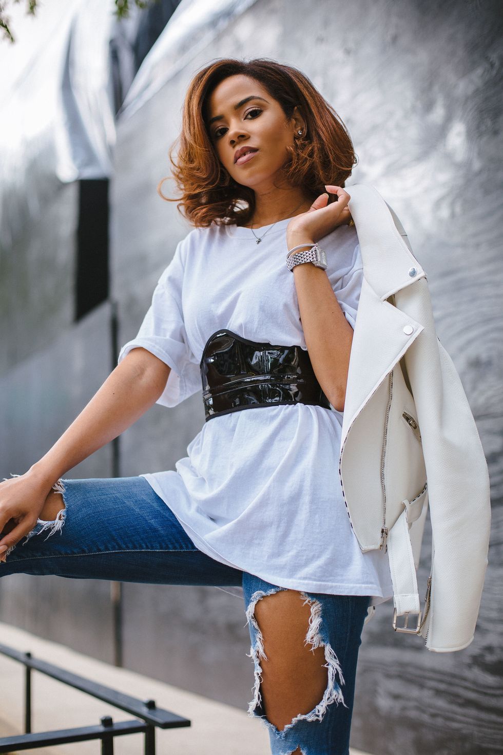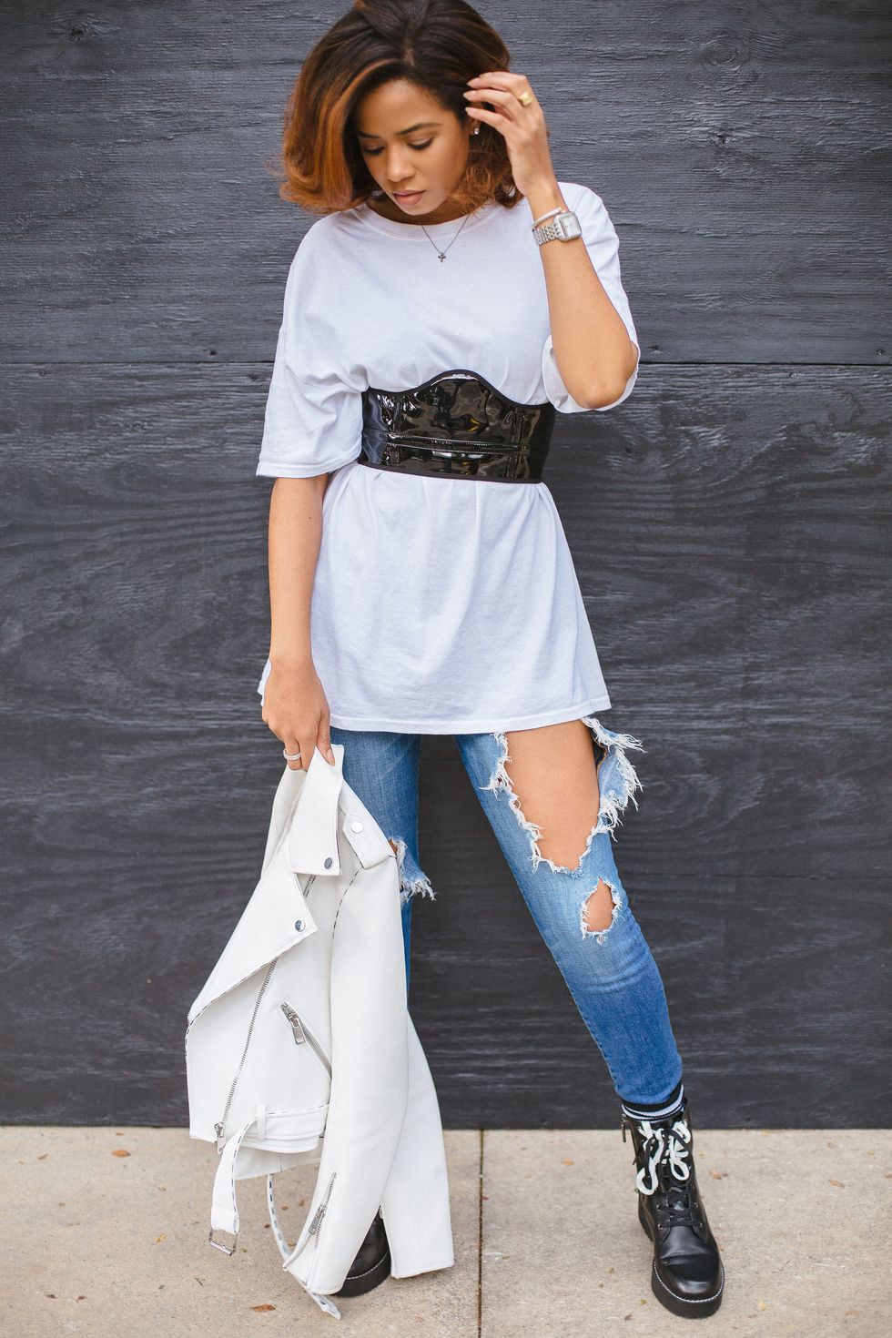 I paired a corset-style patent leather waist belt with some distressed jeans, an oversized white tee, platform boots, and a white leather jacket. Notice the detail in the belt, it's shaped to sit right underneath the chest to accentuate your shape and has a fun exposed silver zipper in the back. The great thing about this look is that it can be dressed up or down. Make a quick wardrobe change into a short faux fur coat and a pair of boots or heels and you've gone from day-time-play, to night-time-chic just like that.