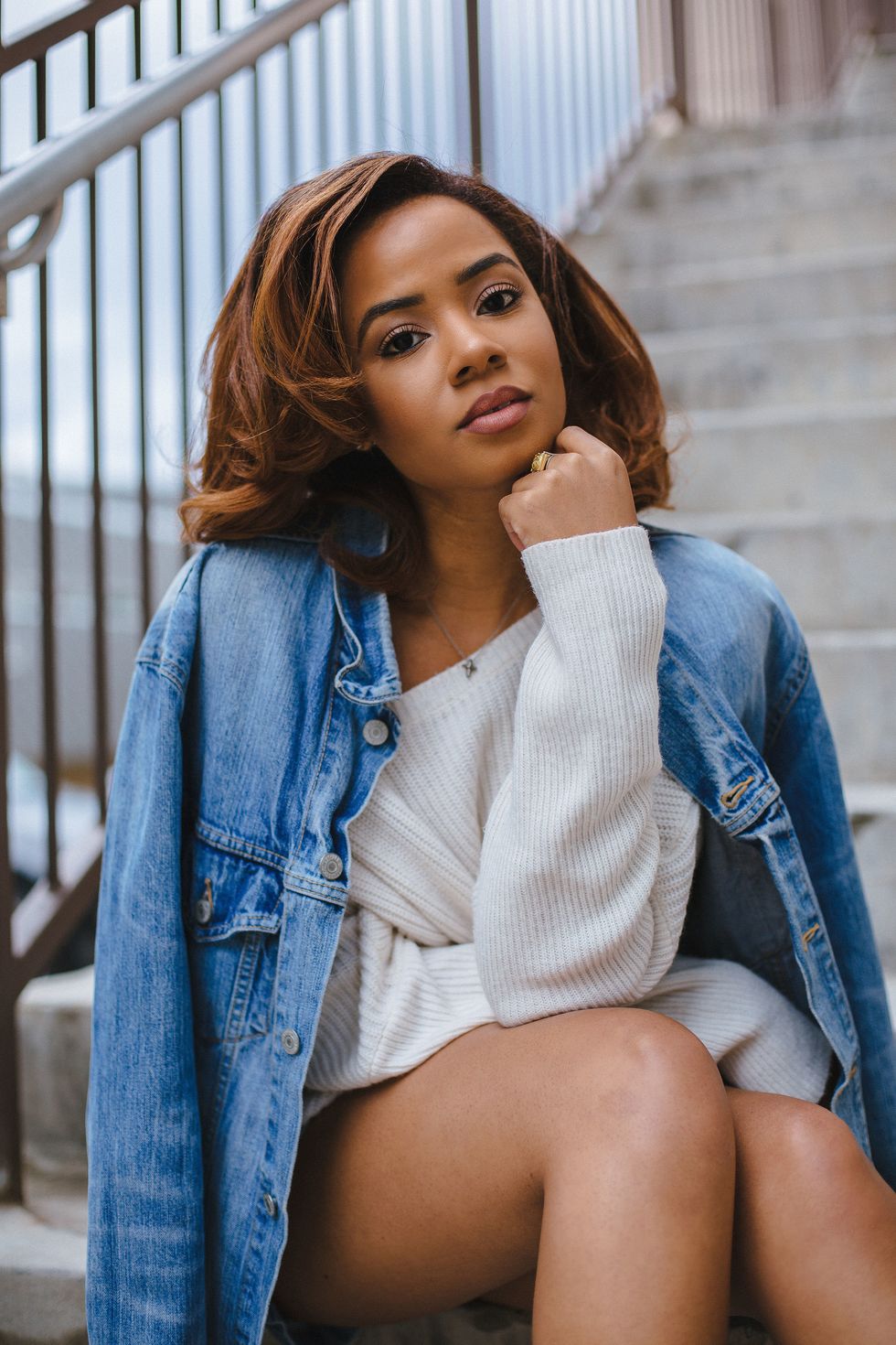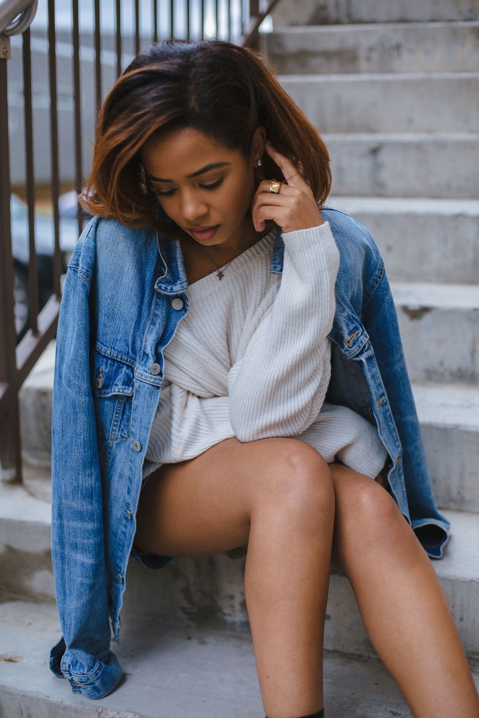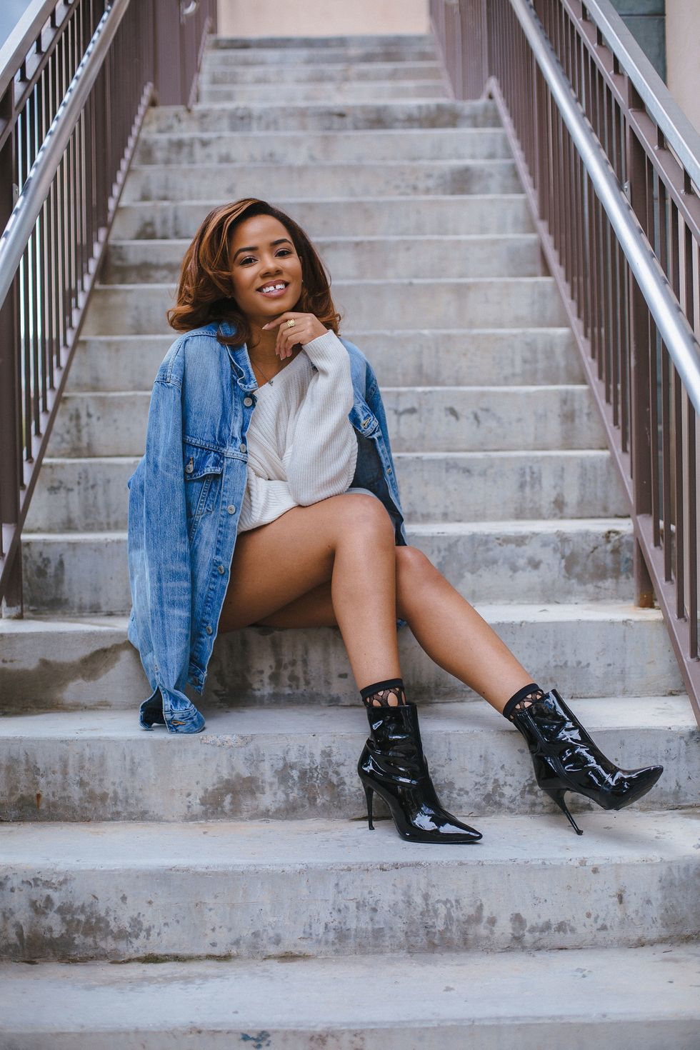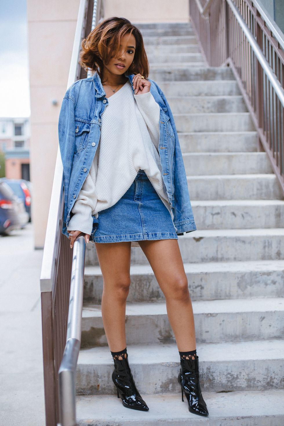 In this look, I styled a pair of Steve Madden stiletto boots with a denim skirt, oversized jacket, and an off-the-shoulder sweater. The skirt is on the shorter side, so with the heels being so high, I offset the look with both an oversized sweater and jacket. Boom, balance.