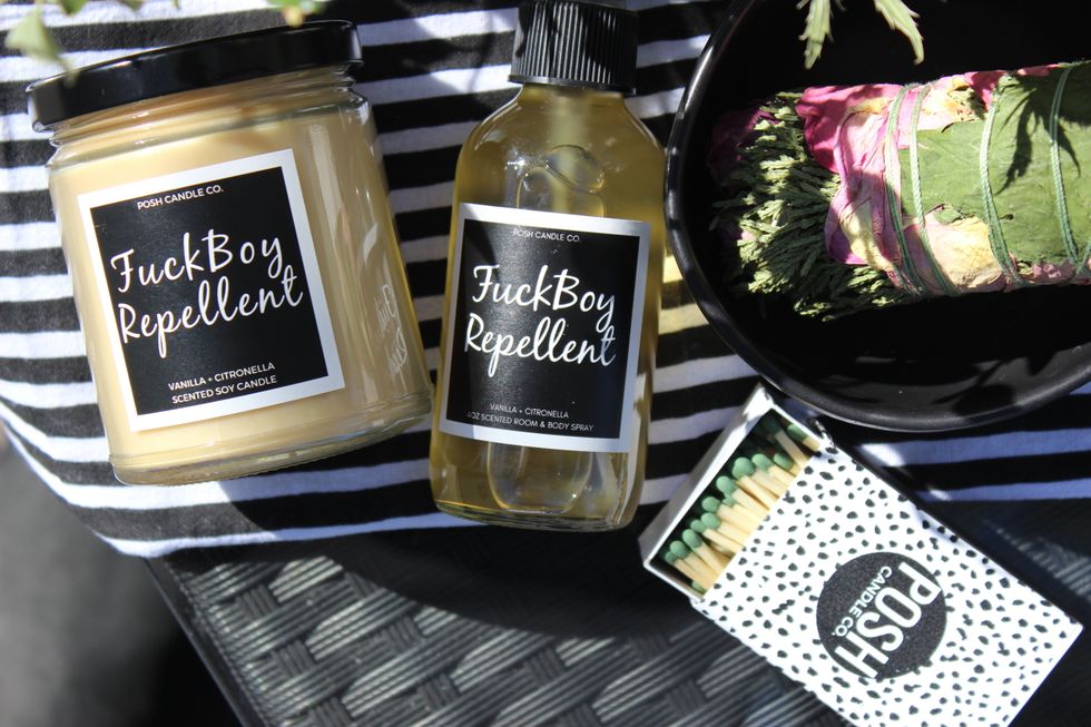 I thought about the way that I use candles and the way they were being presented to me at the stores. I wasn't finding that connection. I burn candles when I'm in work mode, when I'm cleaning, catching time to myself as a mom, during bathtime or when doing meditation. I wanted the phrases to promote or encourage a positive mindset, promote self-love, or spark laughter. For example, our "F**kboy Repellent" is one of the candles that make people laugh.