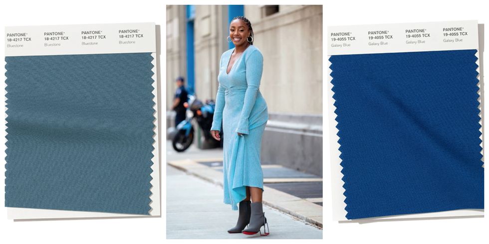 Of the color palette, these shades of blue are considered the perfect primary color. Our favorite Editor-In-Chief, Lindsay Peoples Wagner, stunned in bluestone knit dress and gray booties.