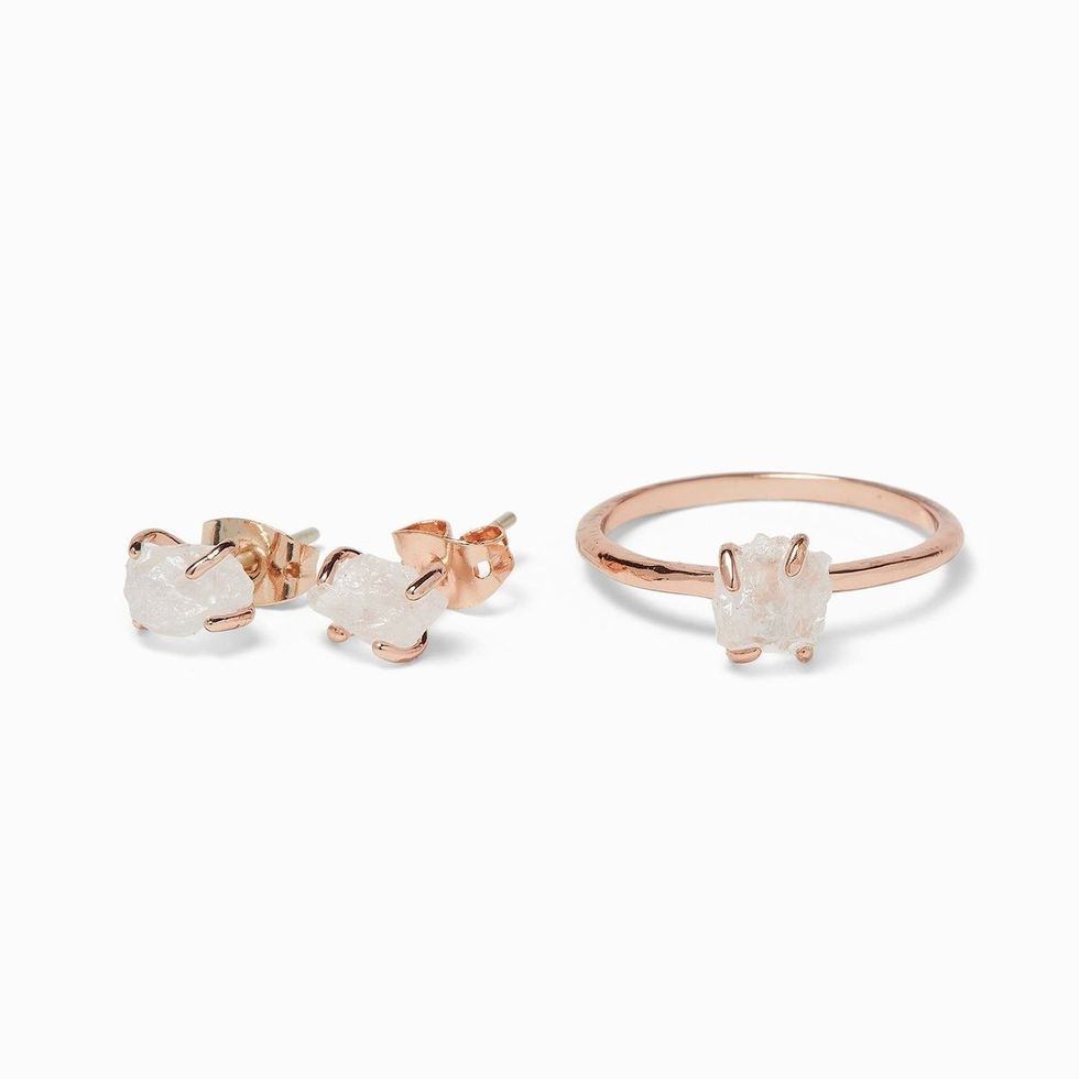 Many people who believe in the cleansing power of crystals like to wear their gems on their body. This earring and ring set from Pura Vida makes that easy to do. Raw Clear Quartz, aka the "Master Healer", which is known for its ability to balance and absorb energy, is the mineral used in this jewelry.