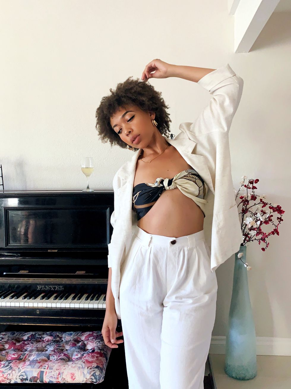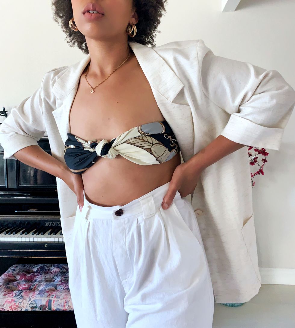 Summer cannot officially begin without owning a pair of white wide leg linen pants. Casual and extremely versatile, linen is a closet staple and much-needed to create a chic staycation look, period. Dress up your pants by adding a linen blazer as well as a chain print scarf top to elevate your at-home look. Whether serving guests or serving looks, your outfit too will be delicious at the next backyard BBQ.