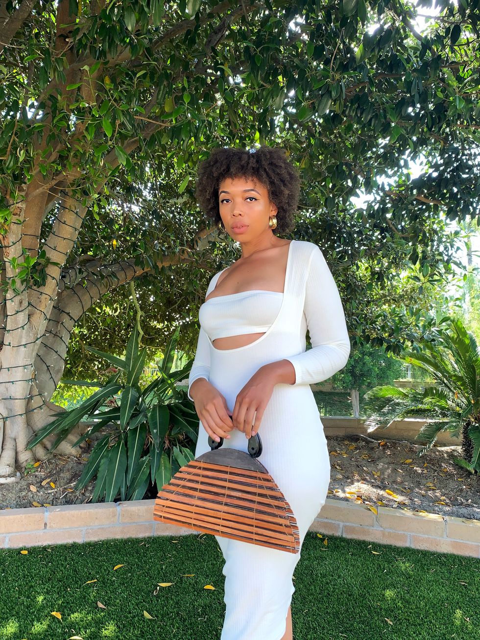 For a lightweight and comfortable feel perfect for warm summer weather, the bodycon ribbed dress hugs curves in all the proper ways. All-white is a favorite summer go-to, adding a crisp and refreshing element for an evening outdoors. In this look, I paired it with a bright wrap-around sandal for an extra pop of color. This dress is the perfect basic, easy to accessorize while making it your own. Add a one of a kind wooden bag to complete your comfortably chic staycation-ready vibe.