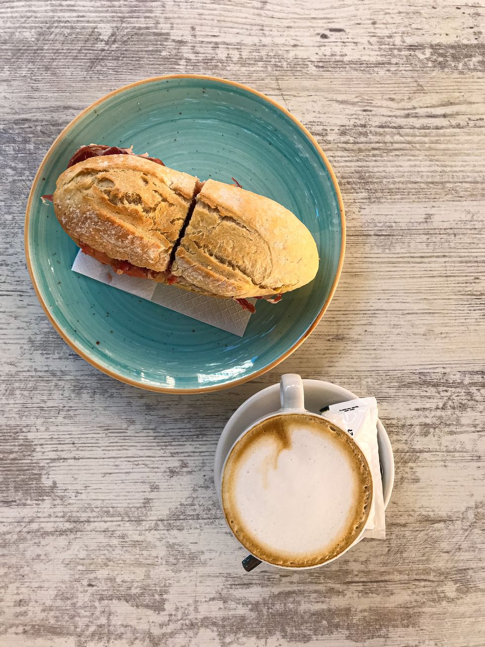 In Spain, this is the smallest meal of the day and typically consists of fresh bakery bread or pastries with coffee or juice. Locals may eat fruit, churros, sandwiches on half-baguettes, or an open-toasted baguette with toppings. My favorite combo is olive oil, crushed tomato, and Spanish ham.