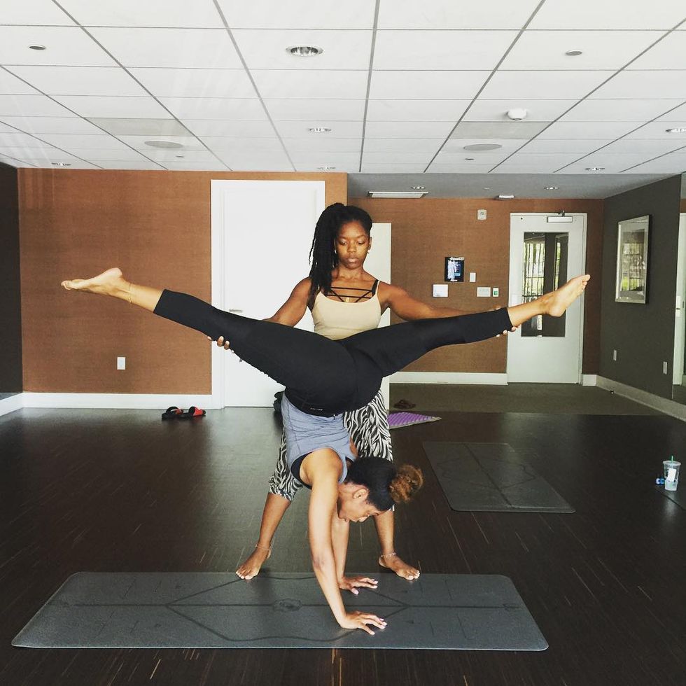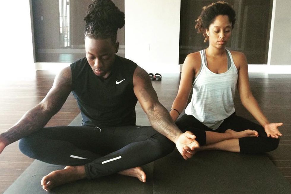 Not wanting to get his feet wet in a formal class (let's be real, it's can be distracting to be in a room of women contorting their bodies into unimaginable positions), Shelah reached out to a Racheal Weathers—a self-taught yoga guru who goes by Yoga Racheal, and who has gained a massive following on social media—who agreed to do private sessions with the couple while they were in Los Angeles for the summer.
