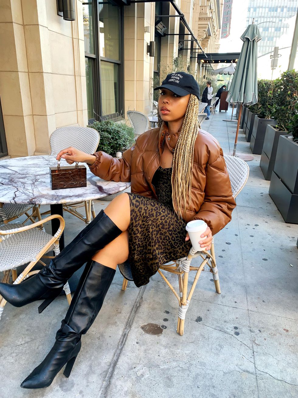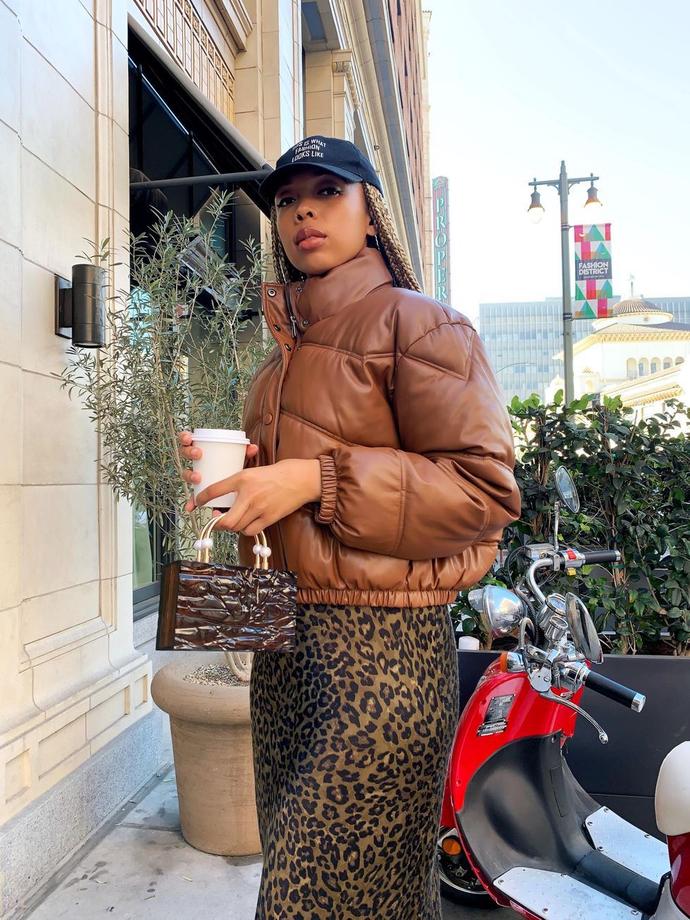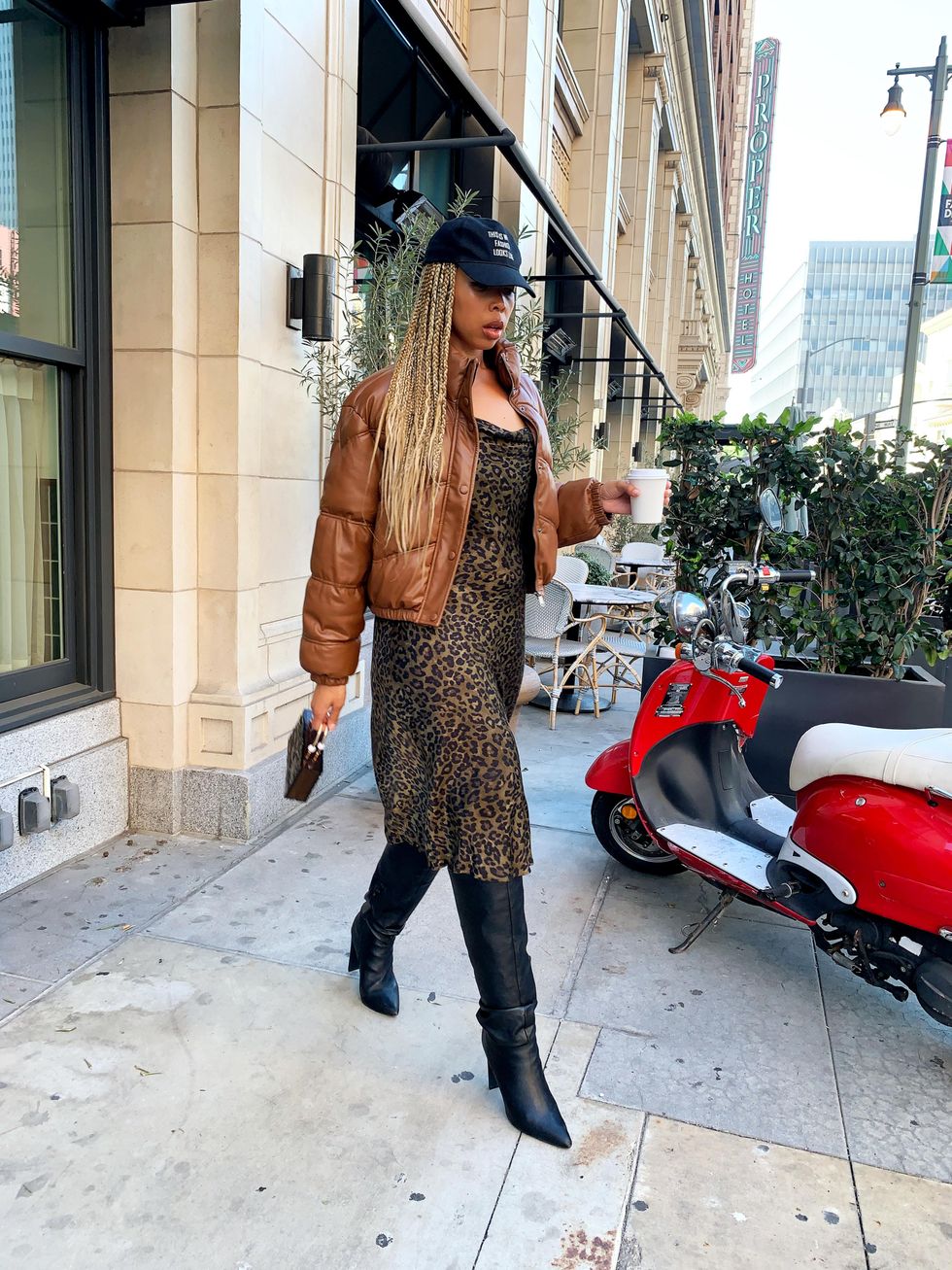 It was love at first sight when I spotted this chocolate brown puffer coat. Elevating the darker tones, I opted for a slinky leopard print dress and black leather boots. Planning a quick morning trip to the corner cafe before taking care of today’s business, I threw on a sleek cap to top off this look.
