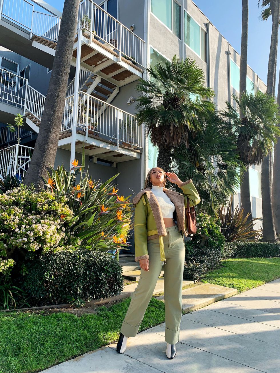 High on the hottest trends list this season are aviator jackets lined with contrasting sherpa. Quirky and fun, I love this two-toned faux leather and shearling combination. Keeping it light and colorful, I added a soft green trouser along with a cropped cream knit top complete with multi-panel boots.