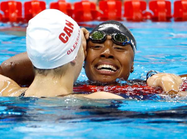 Simone's win looked bleak at the beginning of the second lap. But midway through, she darted through the water like a torpedo taking aim at its final destination, and finished the race in 52:70, tying with 16-year-old Canadian swimmer Penny Oleksiak.