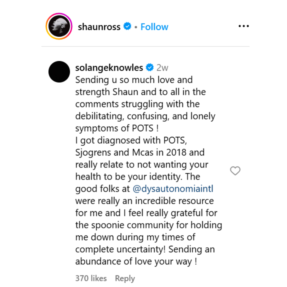 In a Reel posted to Instagram by model and fellow musician Shaun Ross, 33, got real about his experience with Postural Orthostatic Tachycardia Syndrome (POTS), a condition that followed his bout with long COVID. Solange left an empathetic comment, shedding light on her own experiences with the "debilitating, confusing, and lonely" symptoms of the condition that is POTS. The singer also went on to reveal she had been diagnosed with Sjogren's and MCAS in 2018.