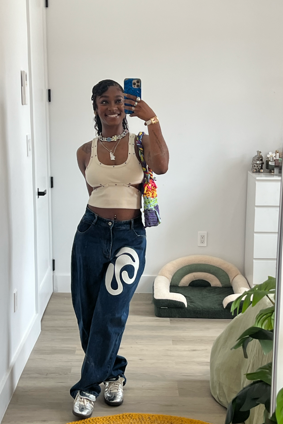 “I love the big-bottom, small-top silhouette. Not only do I find it super flattering, I would describe my style as a mix of masculine and feminine, so a cute crop top with baggy jeans, or jorts, and a small tank is my go-to.”