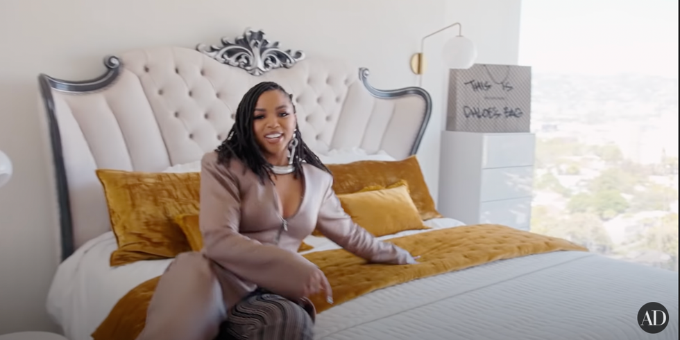She also has LEGOs that she works on, which she said calms her down. The Grown-ish star credited her godmother for designing her living place and giving it an “RB” vibe, which stands for “rich bitch.” That vibe flows into her bedroom with a bed that is “fit for a queen.” “I’m obsessed with my bed. Every time I lay in my bed I feel like a queen. My Godmom did the most amazing job.” Another favorite thing in her bedroom is her hidden shoe rack.