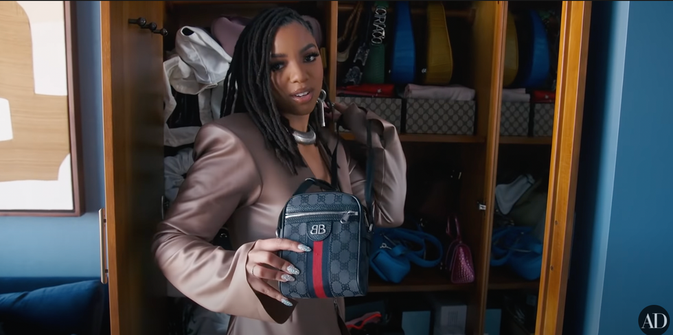 She also has LEGOs that she works on, which she said calms her down. The Grown-ish star credited her godmother for designing her living place and giving it an “RB” vibe, which stands for “rich bitch.” That vibe flows into her bedroom with a bed that is “fit for a queen.” “I’m obsessed with my bed. Every time I lay in my bed I feel like a queen. My Godmom did the most amazing job.” Another favorite thing in her bedroom is her hidden shoe rack.
