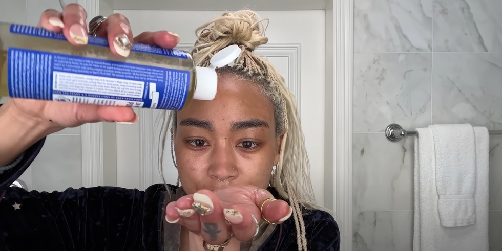 In the Vogue Beauty Secrets video, the 26-year-old started off cleaning her face with Dr. Bronner's Pure Castille Soap in Peppermint. She then used Dr. Dennis Gross Pewter DRx SpectraLite FaceWare Pro, which comes in three settings. When she moved on to Dr. Dennis Gross Alpha Beta Extra Strength Daily Peel she began opening up about her skin journey. The Korean and Black actress revealed that her skin started to change in her 20s.